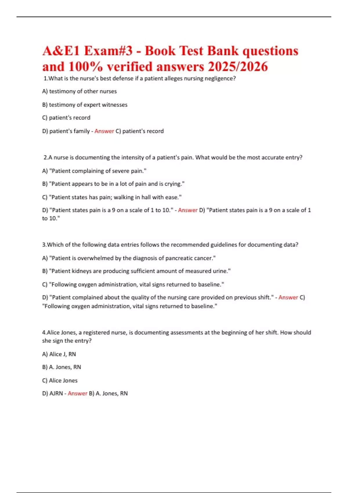A&E1 Exam#3 - Book Test Bank questions and 100% verified answers 2025/2026 1.What is the nurse's best defense if a patient alleges nursing negligence? A) testimony of other nurses B) testimony of expert witnesses C) patient's record D) patient's family - Answer C) patient's record 2.A nurse is documenting the intensity of a patient's pain. What would be the most accurate entry? A) "Patient complaining of severe pain." B) "Patient appears to be in a lot of pain and is crying." C) "Patient states has pain; walking in hall with ease." D) "Patient states pain is a 9 on a scale of 1 to 10." - Answer D) "Patient states pain is a 9 on a scale of 1 to 10." 3.Which of the following data entries follows the recommended guidelines for documenting data? A) "Patient is overwhelmed by the diagnosis of pancreatic cancer." B) "Patient kidneys are producing sufficient amount of measured urine." C) "Following oxygen administration, vital signs returned to baseline." D) "Patient complained about the quality of the nursing care provided on previous shift." - Answer C) "Following oxygen administration, vital signs returned to baseline." 4.Alice Jones, a registered nurse, is documenting assessments at the beginning of her shift. How should she sign the entry? A) Alice J, RN B) A. Jones, RN C) Alice Jones D) AJRN - Answer B) A. Jones, RN 5.In which of the following cases should a progress note be written? Select all that apply.