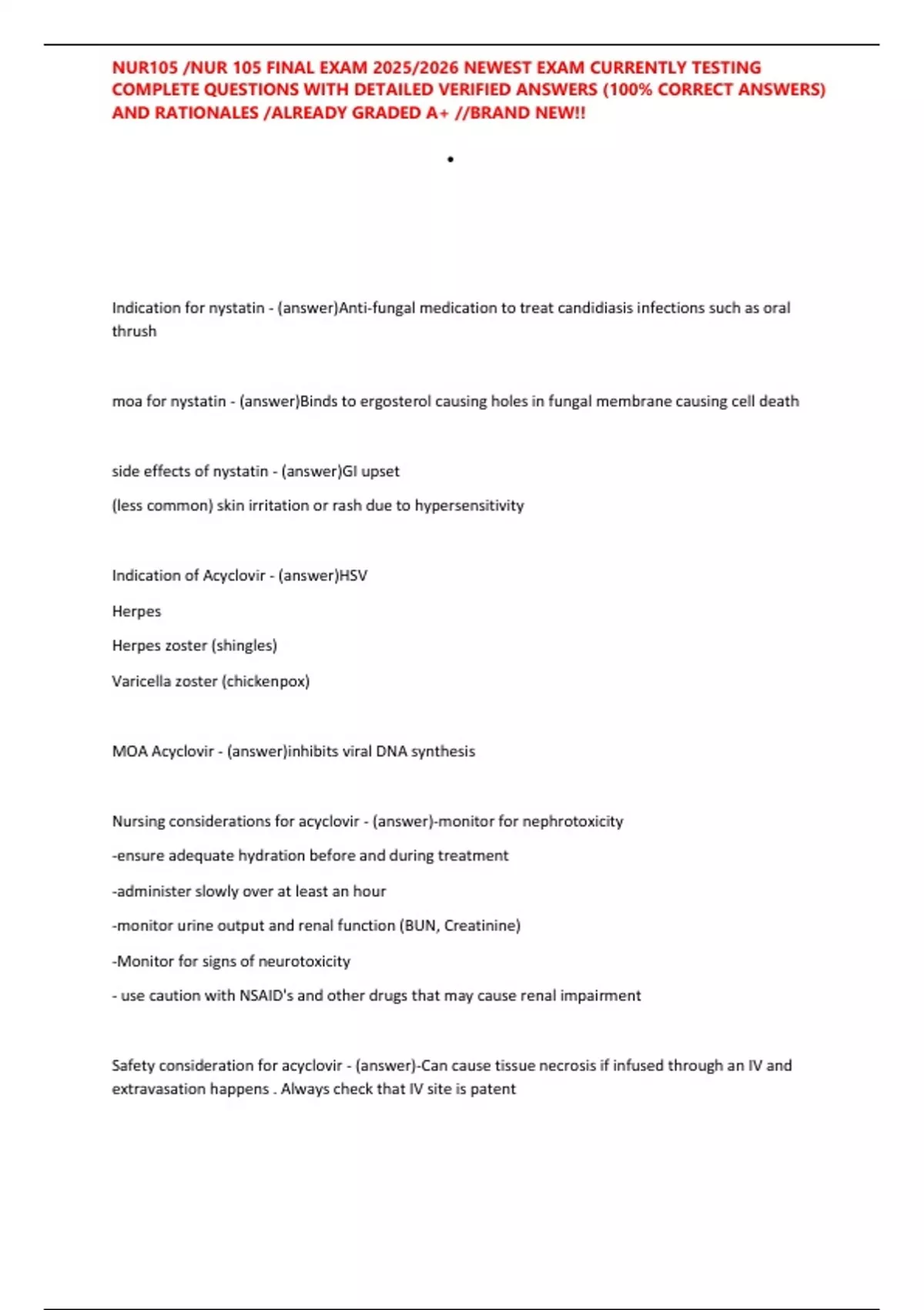 Nursing considerations for acyclovir - (answer)-monitor for nephrotoxicity