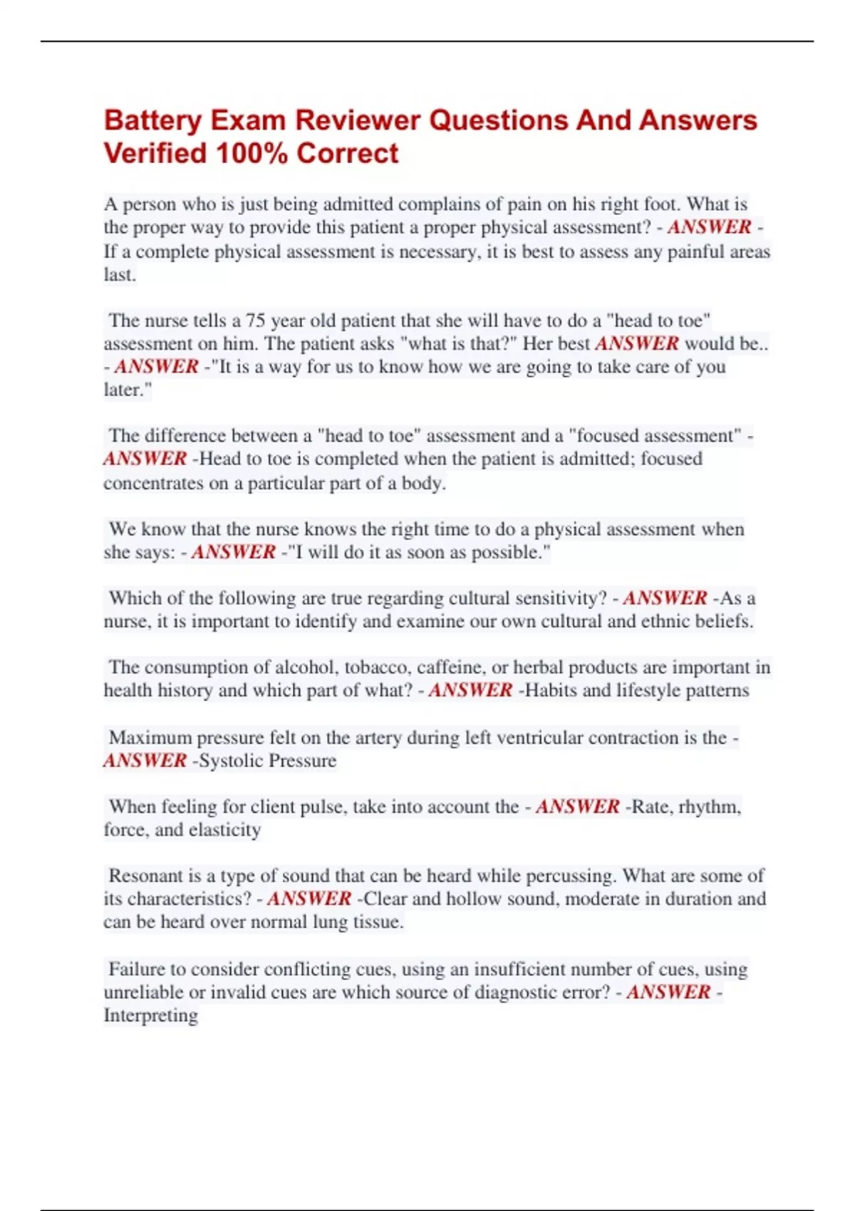 Battery Exam Reviewer Questions And Answers Verified 100% Correct A person who is just being admitted complains of pain on his right foot. What is the proper way to provide this patient a proper physical assessment? - ANSWER If a complete physical assessment is necessary, it is best to assess any painful areas last. The nurse tells a 75 year old patient that she will have to do a "head to toe" assessment on him. The patient asks "what is that?" Her best ANSWER would be.. - ANSWER -"It is a way for us to know how we are going to take care of you later." The difference between a "head to toe" assessment and a "focused assessment" - ANSWER -Head to toe is completed when the patient is admitted; focused concentrates on a particular part of a body. We know that the nurse knows the right time to do a physical assessment when she says: - ANSWER -"I will do it as soon as possible." Which of the following are true regarding cultural sensitivity? - ANSWER -As a nurse, it is important to identify and examine our own cultural and ethnic beliefs. The consumption of alcohol, tobacco, caffeine, or herbal products are important in health history and which part of what? - ANSWER -Habits and lifestyle patterns Maximum pressure felt on the artery during left ventricular contraction is the - ANSWER -Systolic Pressure When feeling for client pulse, take into account the - ANSWER -Rate, rhythm, force, and elasticity Resonant is a type of sound that can be heard while percussing. What are some of its characteristics? - ANSWER -Clear and hollow sound, moderate in duration and can be heard over normal lung tissue. Failure to consider conflicting cues, using an insufficient number of cues, using unreliable or invalid cues are which source of diagnostic error? - ANSWER Interpreting When documenting... - ANSWER -Do not generalize or form judgements through written communication The client verbally reports pain at a level of 8 or 9 when it becomes sharp is an example of - ANSWER -Subjective data Bathing, dressing, toileting, eating are examples of - ANSWER -Activities of daily living The mnemonic PQRSTU stands for: - ANSWER -Provocative or pallative, quality or quantity, region or radiation, severity scale, timing, and understanding patient's perception When interviewing Mr. C, an 89 year old man from Greece who doesn't understand English, it is important to - ANSWER -Find an interpreter or speak slowly Ms. B is at the clinic today and the nurse is explaining what a heart attack is. The nurse says "A myocardial infarction can be serious and is caused by a blood clot that blocks one of the coronary arteries. This can lead to a rupture of a vulnerable atherosclerotic plaque. This is an example of which interviewing traps - ANSWER -Using professional jargon Which of these are considered as open ended questions? - ANSWER -How have you been getting along? Nurse Jarrel is conducting a health awareness seminar of the female reproductive system. A student asks the process when the ovaries releases eggs into the fallopian tubes, and responds the correct ANSWER with? - ANSWER -Ovulation Tendons are? - ANSWER -Connective tissue that attaches bone to skeletal muscle Ligaments are - ANSWER -strong bands of fibrous tissue that connects bone to each other Cartilage are - ANSWER -Tough fibrous substance that fills the space between joints and acts as shock absorbers. The nurse is preparing to assess the abdomen of a hospitalized client 2 days after abdominal surgery. The nurse should first - ANSWER -Inspect the abdominal area A client has experienced hematemesis, what is this? - ANSWER -Blood in the vomit What is hematuria? - ANSWER -blood in the urine What is hematochezia? - ANSWER -bright red blood in stool What is melena? - ANSWER -A black, tarry stool indicating a GI bleed What is haemoptysis? - ANSWER -coughing up blood The nurse is assessing an older client who has lost 5 pounds since her last visit 1 year ago. The client tells the nurse her husband died 2 months ago. The nurse should assess for? - ANSWER -Appetite changes The nurse is planning to assess the abdomen of an adult male, what should be done first? - ANSWER -Ask the client to empty his bladder During a physical assessment, the nurse documents the presence of eupneic respirations on the client's medical record. What does this finding suggest? - ANSWER -Normal respirations A client with a stranded trapezius muscle complains of having occasional shortness of breath. What might be the reason for this symptom? - ANSWER -The strained muscle is an accessory muscle of respiration. Consists of an inspiratory phase and an expiratory phase of breathing. - ANSWER -Respiratory Cycle must sit up to breathe easily - ANSWER -A person with orthopnea No breathing at all - ANSWER -Apnea The complementary branch of science that studies the functions of the body, in other words how the body parts work and carry out their life sustaining activities? - ANSWER -Physiology
