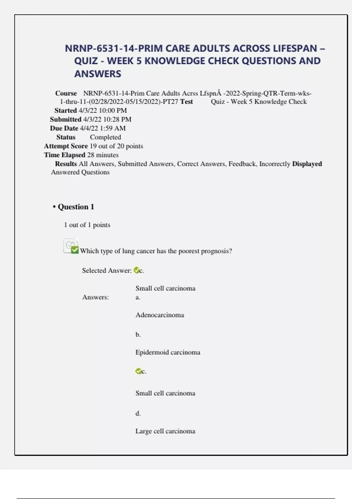 NRNP-6531-14-PRIM CARE ADULTS ACROSS LIFESPAN QUIZ - WEEK 5 KNOWLEDGE CHECK QUESTIONS AND ANSWERS Course NRNP-6531-14-Prim Care Adults Acrss Lfspn -2022-Spring-QTR-Term-wks- 1-thru-11-(02/28/2022-05/15/2022)-PT27 Test Quiz - Week 5 Knowledge Check Started 4/3/22 10:00 PM Submitted 4/3/22 10:28 PM Due Date 4/4/22 1:59 AM Status Completed Attempt Score 19 out of 20 points Time Elapsed 28 minutes Results All Answers, Submitted Answers, Correct Answers, Feedback, Incorrectly Displayed Answered Questions • Question 1 1 out of 1 points Which type of lung cancer has the poorest prognosis? Selected Answer: c. Small cell carcinoma Answers: a. Adenocarcinoma b. Epidermoid carcinoma c. Small cell carcinoma d. Large cell carcinoma • Question 2 1 out of 1 points Antibiotic administration has been demonstrated to be of little benefit to the treatment of which of the following disease processes? Selected Answer: b. Acute bronchitis Answers: a. Chronic sinusitis b. Acute bronchitis c. Bacterial pneumonia d. Acute exacerbation of chronic bronchitis • Question 3 1 out of 1 points Which of the following patient characteristics are associated with chronic bronchitis? Selected Answer: Answers: a. Overweight, cyanosis, and normal or slightly increased respiratory rate a. Overweight, cyanosis, and normal or slightly increased respiratory rate b. Underweight, pink skin, and increased respiratory rate c. Overweight, pink skin, and normal or slightly increased respiratory rate d. Normal weight, cyanosis, and greatly increased respiratory rate • Question 4 1 out of 1 points Which of the following medication classes should be avoided in patients with acute or chronic bronchitis because it will contribute to ventilation-perfusion mismatch in the patient? Selected Answer: b. Antihistimines Answers: a. Xanthines b. Antihistimines c. Steroids d. Anticholinergics • Question 5 1 out of 1 points