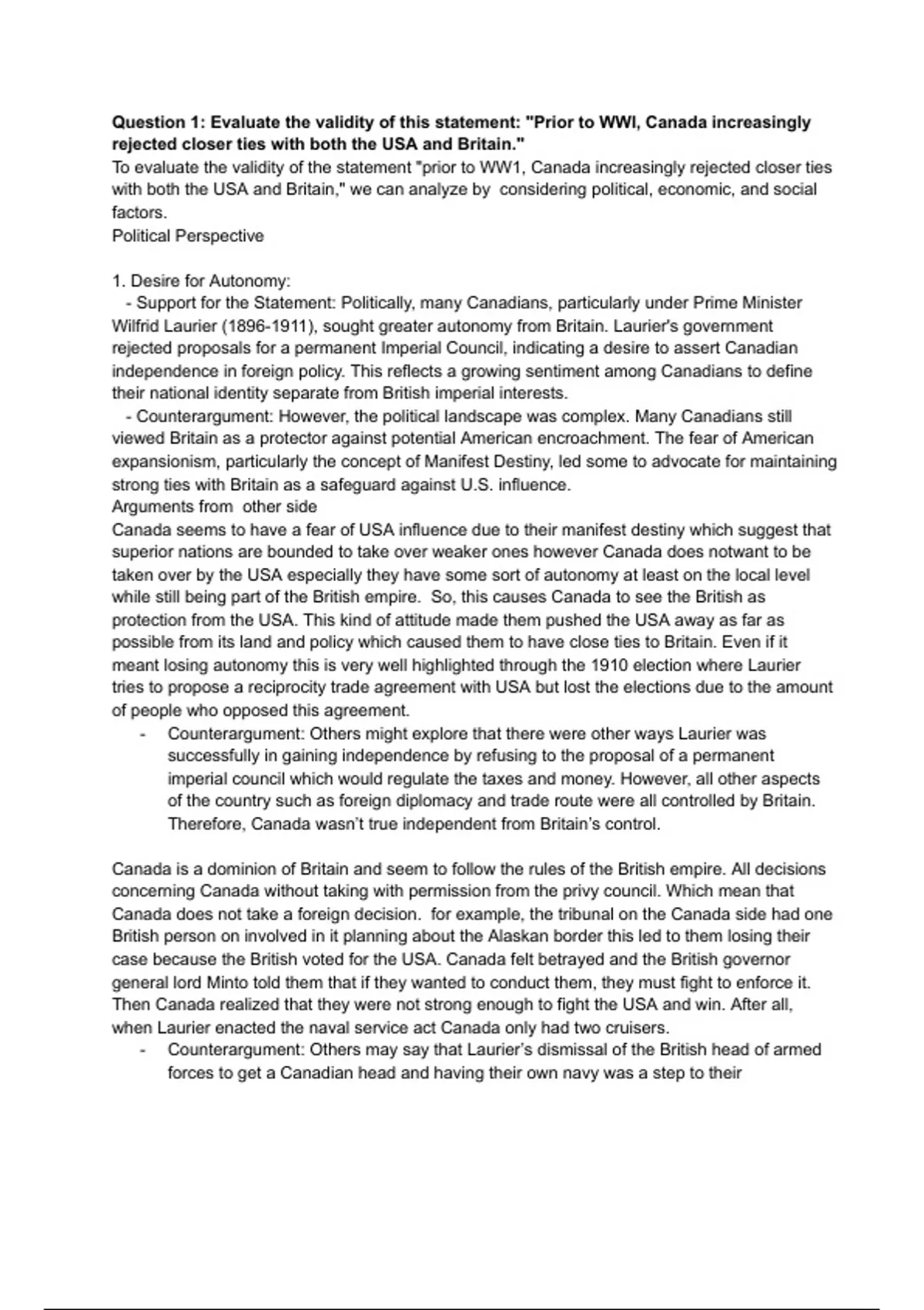 Question 1: Evaluate the validity of this statement: "Prior to WWI, Canada increasingly