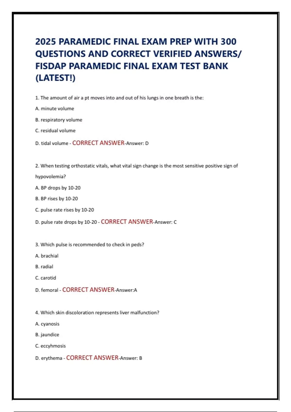 THIS DOCUMENT CONTAINS 300 VERIFIED PRACTICE QUESTIONS AND ANSWERS SPECIFICALLY DESIGNED FOR PARAMEDIC FINAL EXAM PREPARATION. BASED ON THE LATEST FISDAP FORMAT, THE QUESTIONS COVER ADVANCED LIFE SUPPORT, TRAUMA CARE, CARDIOLOGY, AIRWAY MANAGEMENT, MEDICAL EMERGENCIES, AND PEDIATRIC CARE. THIS RESOURCE IS IDEAL FOR PARAMEDIC STUDENTS SEEKING COMPREHENSIVE AND ACCURATE REVIEW MATERIAL FOR 2025.