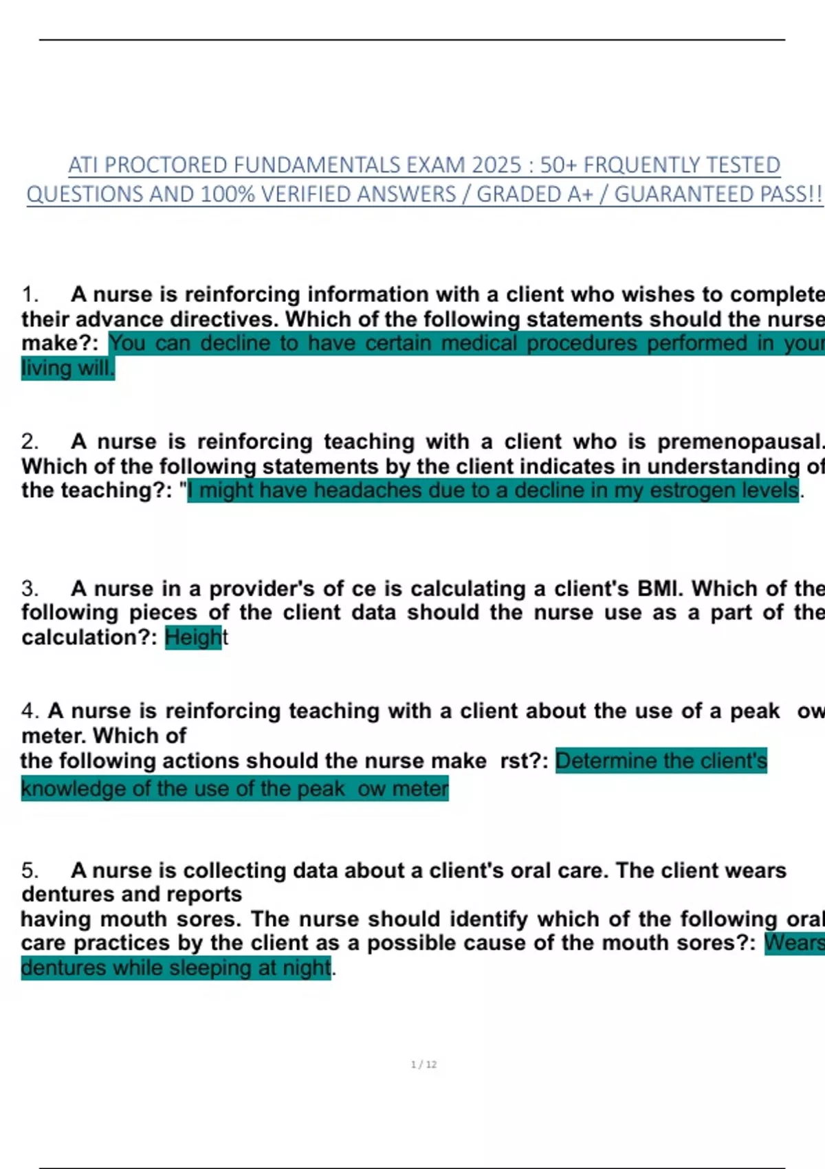ATI PROCTORED FUNDAMENTALS EXAM 2025 : 50+ FRQUENTLY TESTED
