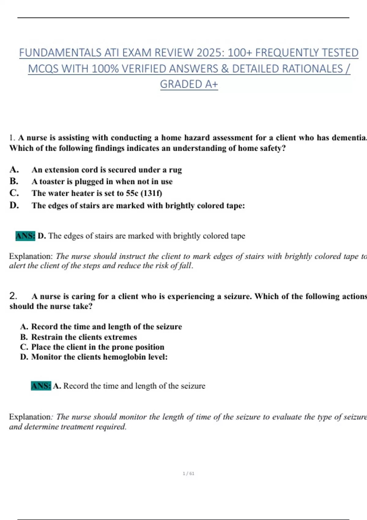 Ace Your ATI Fundamentals Exam with Confidence! What’s Inside? 100+ Frequently Tested MCQs with 100% Verified Answers & Detailed Rationales—straight from the 2025 ATI Fundamentals Exam! Graded A+ material designed to boost your scores and master nursing fundamentals. Covers critical topics: Patient Safety, Infection Control, Mobility, Spiritual Care, Documentation, and MORE! Perfect for NCLEX prep, nursing school exams, and ATI review. Why Buy This Document? Save Time: No more digging through textbooks—get high-yield questions that mirror the actual exam. Trusted Content: Based on evidence-based practice and latest ATI guidelines. Quick Learning: Clear rationales help you understand, not just memorize. Proven Results: Used by top nursing students to pass with flying colors! Ideal For: Nursing students taking NURS 101 (Fundamentals of Nursing). ATI Exam candidates seeking a comprehensive review. Future NCLEX test-takers building foundational knowledge.