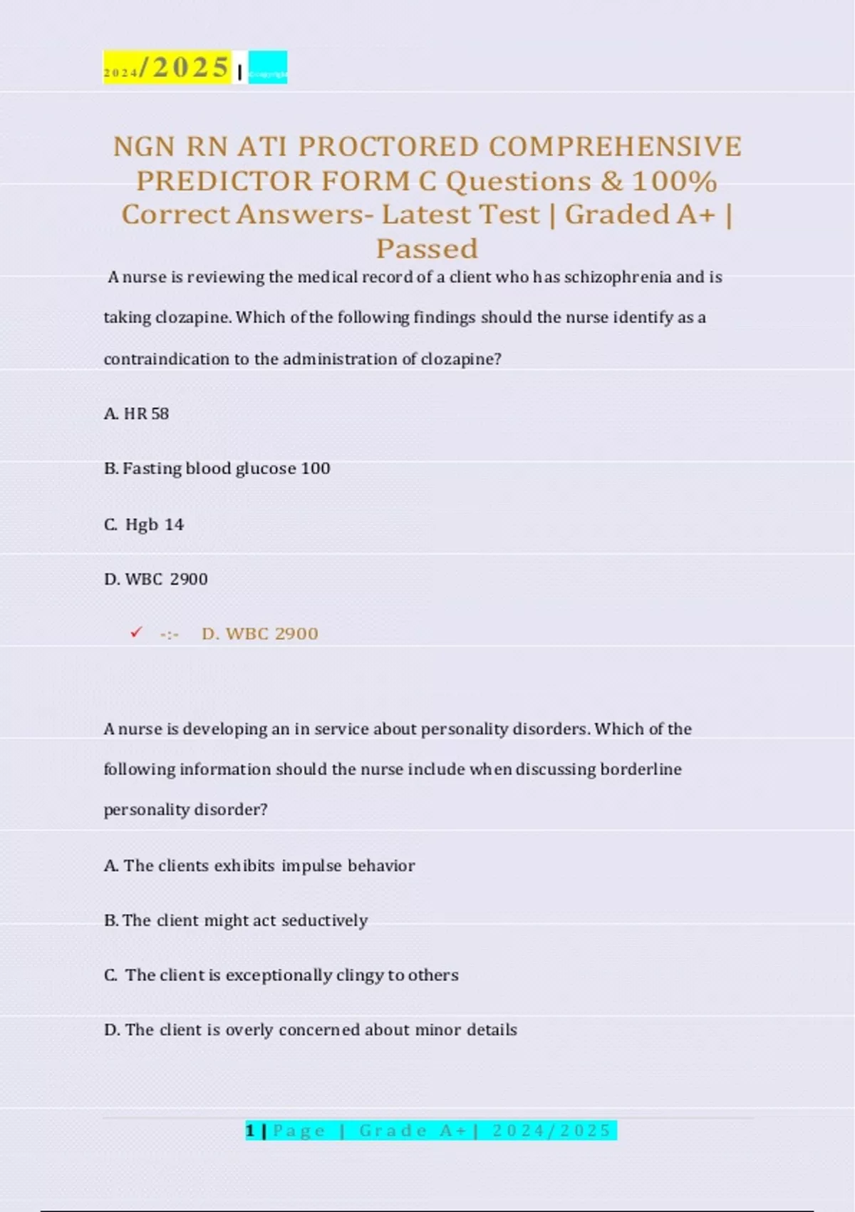 This document contains a complete set of exam questions and 100% correct answers for the NGN RN ATI Proctored Comprehensive Predictor Form C, used in nursing programs across the USA for the academic year 2024/2025. The material covers critical nursing topics, including patient care, pharmacology, respiratory management, cardiovascular assessment, maternal and newborn care, mental health nursing, and community health. All answers are graded A+ and designed to aid in preparation for ATI predictor exams and related NCLEX-RN assessments.