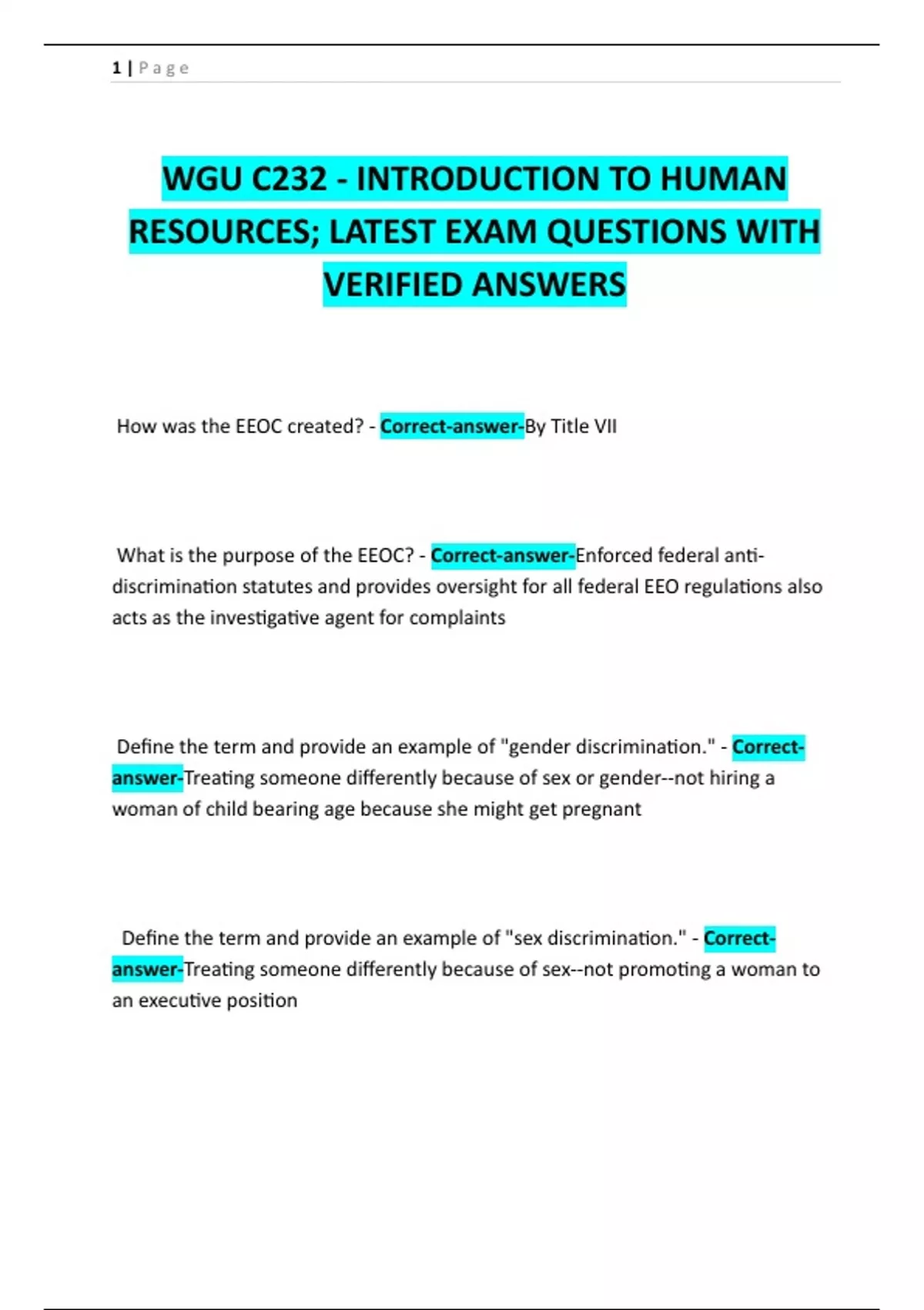 WGU C232 - INTRODUCTION TO HUMAN RESOURCES; LATEST EXAM QUESTIONS WITH VERIFIED ANSWERS