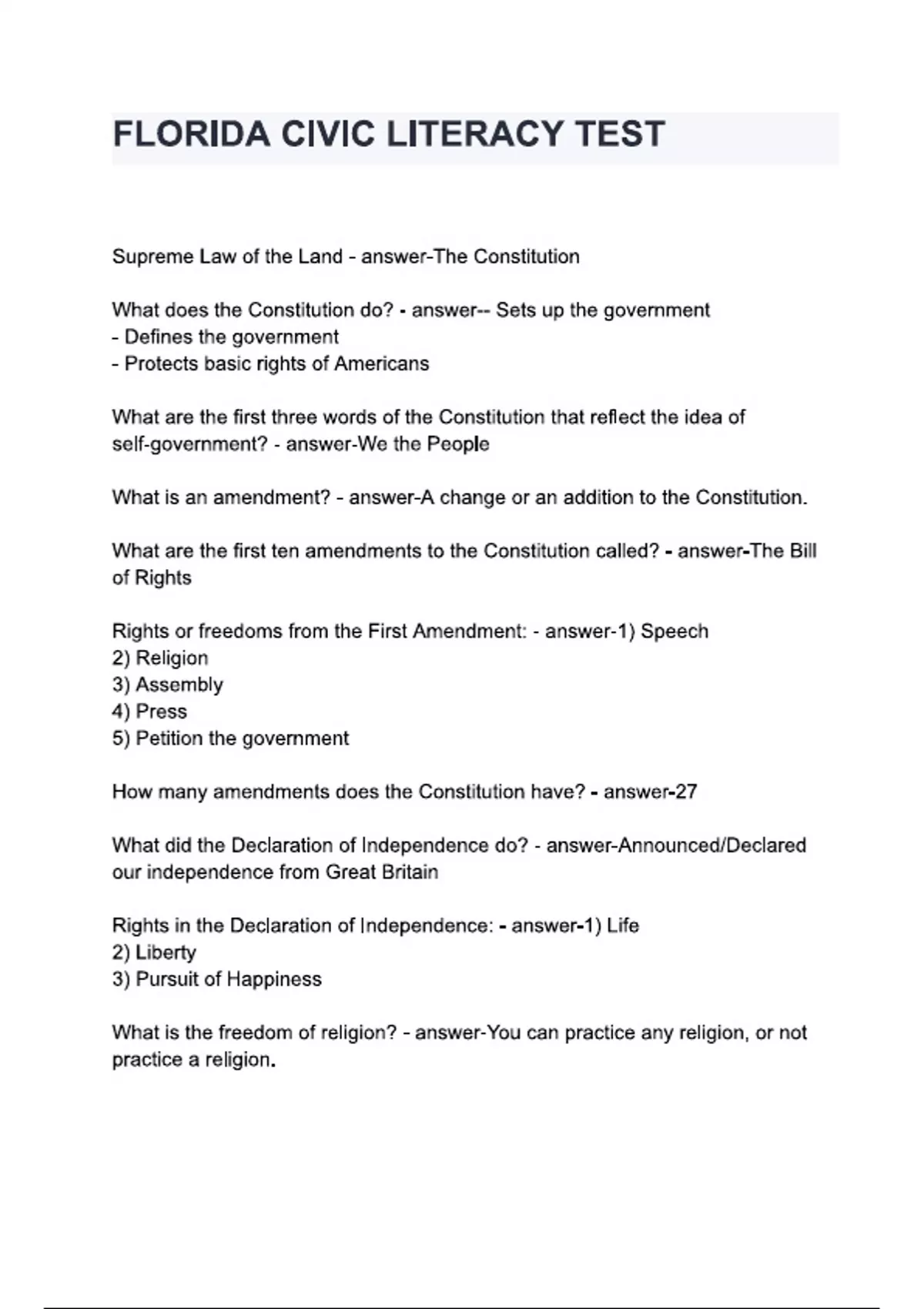 FLORIDA CIVIC LITERACY TEST questions and answers
