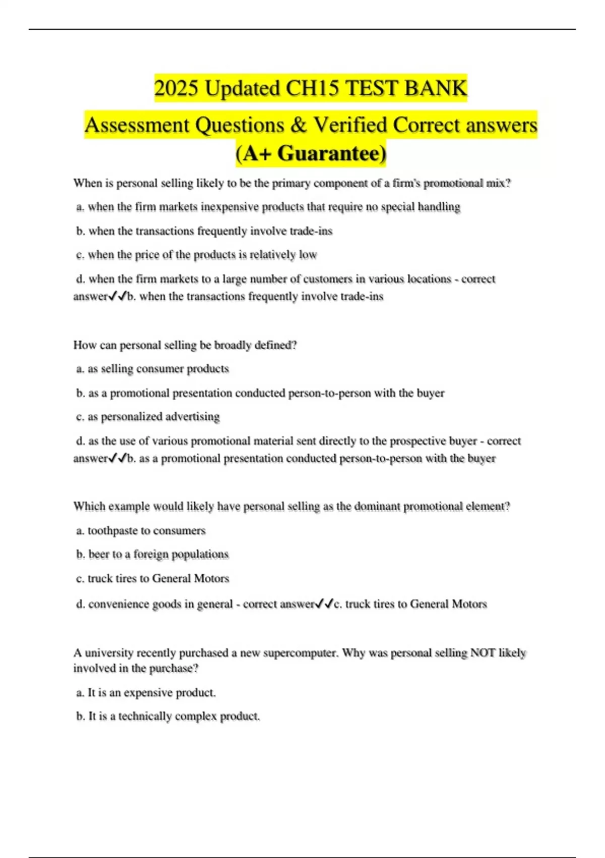 2025 Updated CH15 TEST BANK Assessment Questions & Verified Correct answers (A+ Guarantee) When is personal selling likely to be the primary component of a firm's promotional mix? a. when the firm markets inexpensive products that require no special handling b. when the transactions frequently involve trade-ins c. when the price of the products is relatively low d. when the firm markets to a large number of customers in various locations - correct answer b. when the transactions frequently involve trade-ins How can personal selling be broadly defined? a. as selling consumer products b. as a promotional presentation conducted person-to-person with the buyer c. as personalized advertising d. as the use of various promotional material sent directly to the prospective buyer - correct answer b. as a promotional presentation conducted person-to-person with the buyer
