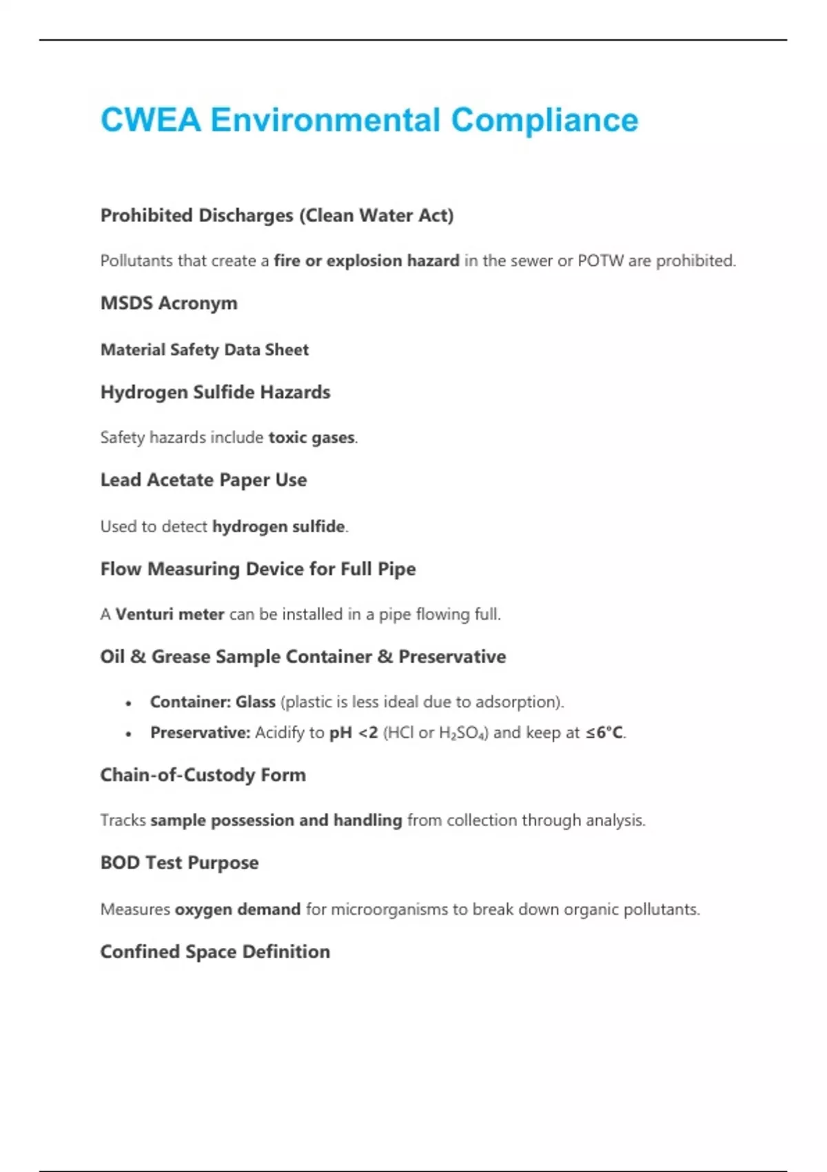 Prohibited Discharges (Clean Water Act) Pollutants that create a fire or explosion hazard in the sewer or POTW are prohibited. MSDS Acronym Material Safety Data Sheet Hydrogen Sulfide Hazards Safety hazards include toxic gases. Lead Acetate Paper Use Used to detect hydrogen sulfide. Flow Measuring Device for Full Pipe A Venturi meter can be installed in a pipe flowing full. Oil & Grease Sample Container & Preservative • Container: Glass (plastic is less ideal due to adsorption). • Preservative: Acidify to pH <2 (HCl or H₂SO₄) and keep at ≤6°C. Chain-of-Custody Form Tracks sample possession and handling from collection through analysis. BOD Test Purpose Measures oxygen demand for microorganisms to break down organic pollutants. Confined Space Definition• Large enough to enter/work in. • Restricted entry/exit. • Not designed for continuous occupancy.