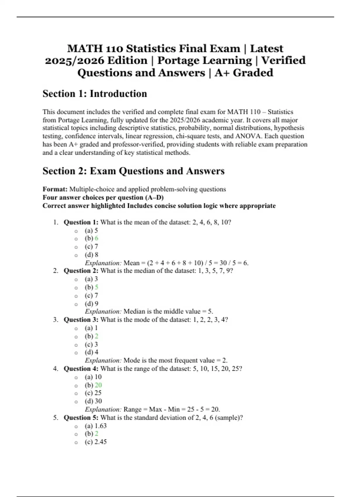 This document includes the verified and complete final exam for MATH 110 – Statistics