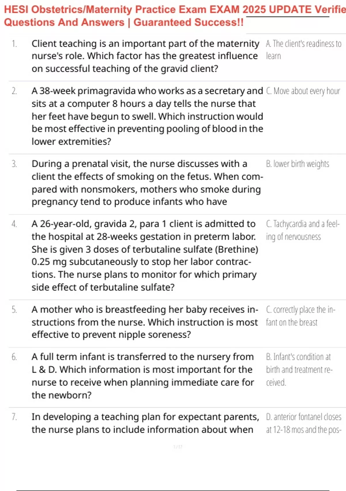 HESI Obstetrics/Maternity Practice Exam EXAM 2025 UPDATE Verified Questions And Answers | Guaranteed Success!!