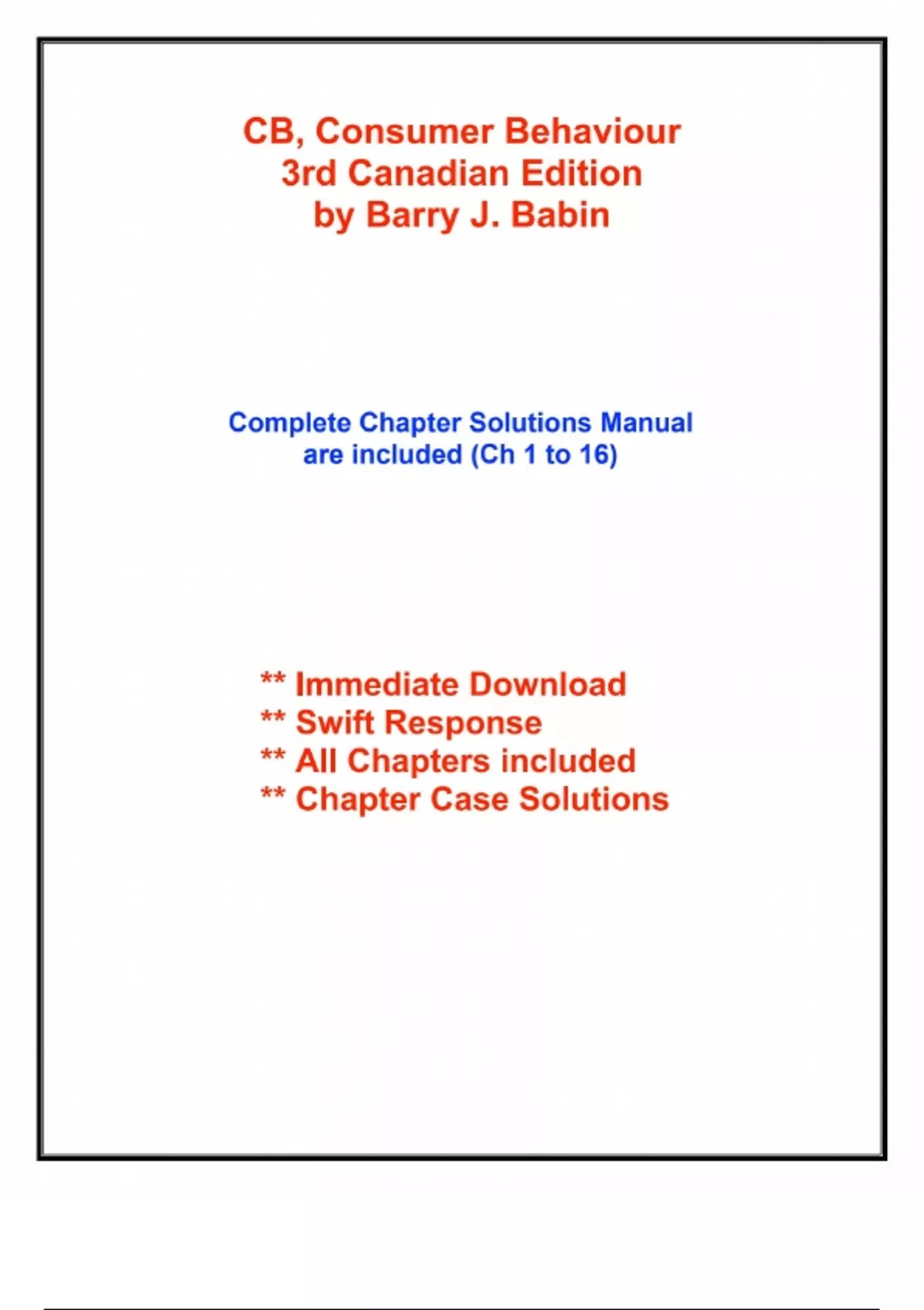 This document provides the complete instructor manual and solutions set for CB – Consumer Behaviour (3rd Canadian Edition) by Barry J. Babin. It includes chapter-by-chapter solutions, detailed outlines, discussion questions, and additional assignments for all 16 chapters. The content supports teaching and learning with case solutions, rubrics, perceptual mapping exercises, and in-depth breakdowns of marketing concepts such as consumer value, segmentation, and behaviour analysis ; ISBN13: 9781774746646....(Full Chapters included Chapter 1 to 16)...Chapter 1: What Is CB, and Why Should I Care? Chapter 2: Value and the Consumer Behaviour Value Framework Chapter 3: Consumer Learning Starts Here: Perception Chapter 4: Comprehension, Memory, and Cognitive Learning Chapter 5: Motivation and Emotion: Driving Consumer Behaviour Chapter 6: Personality, Lifestyles, and the Self-Concept Chapter 7: Attitudes and Attitude Change Chapter 8: Consumer Culture Chapter 9: Microcultures Chapter 10: Group and Interpersonal Influence Chapter 11: Consumers in Situations Chapter 12: Decision-Making I: Need Recognition and Search Chapter 13: Decision-Making II: Alternative Evaluation and Choice Chapter 14: Consumption to Satisfaction Chapter 15: Consumer Relationships Chapter 16: Marketing Ethics and Consumer Misbehaviour
