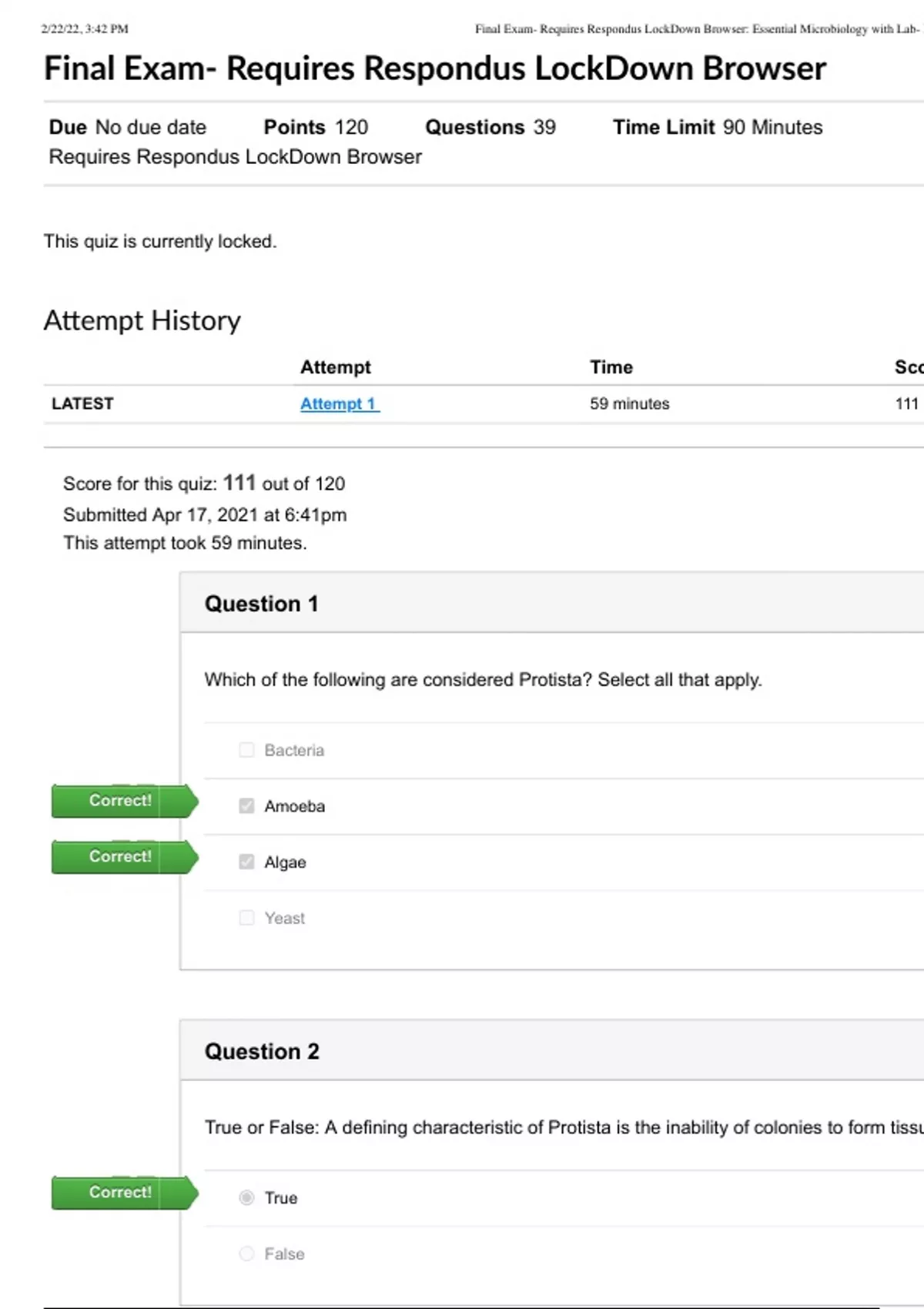 2/22/22, 3:42 PM Final Exam- Requires Respondus LockDown Browser: Essential Microbiology with Lab- K
