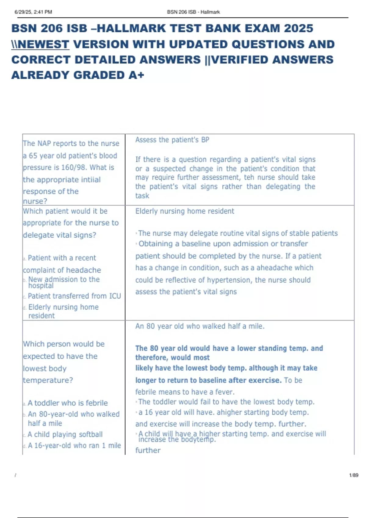 BSN 206 ISB –HALLMARK TEST BANK EXAM 2025