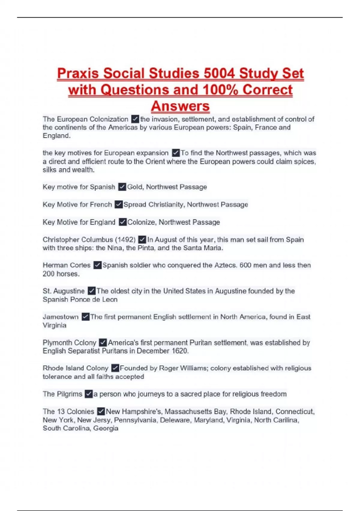 Praxis Social Studies 5004 Study Set with Questions and 100% Correct Answers The European Colonization the invasion, settlement, and establishment of control of the continents of the Americas by various European powers: Spain, France and England. the key motives for European expansion To find the Northwest passages, which was a direct and efficient route to the Orient where the European powers could claim spices, silks and wealth. Key motive for Spanish Gold, Northwest Passage Key Motive for French Spread Christianity, Northwest Passage Key Motive for England Colonize, Northwest Passage Christopher Columbus (1492) In August of this year, this man set sail from Spain with three ships: the Nina, the Pinta, and the Santa Maria. Herman Cortes Spanish soldier who conquered the Aztecs. 600 men and less then 200 horses. St. Augustine The oldest city in the United States in Augustine founded by the Spanish Ponce de Leon Jamestown The first permanent English settlement in North America, found in East Virginia Plymonth Colony America's first permanent Puritan settlement, was established by English Separatist Puritans in December 1620. Rhode Island Colony Founded by Roger Williams; colony established with religious tolerance and all faiths accepted The Pilgrims a person who journeys to a sacred place for religious freedom The 13 Colonies New Hampshire's, Massachusetts Bay, Rhode Island, Connecticut, New York, New Jersy, Pennsylvania, Deleware, Maryland, Virginia, North Carilina, South Carolina, Georgia The Mayflower the ship in which the Pilgrim Fathers sailed from England to Massachusetts in 1620 The Mayflower Compact 1620 - The first agreement for self-government in America. It was signed by the 41 men on the Mayflower and set up a government for the Plymouth colony. The American Revolution was the colonist's revolt against Great Britan. The Stamp Act 1765; law that taxed printed goods, including: playing cards, documents, newspapers, etc. The Townshend Act A tax that the British Parliament placed on leads, glass, paint and tea The Boston Masacre march 5, 1770 a group of colonists prevoked a group of british soldiers in boston, they opened fire, killing five, john adams served as the attorney for the soldiers. paul revere drew a famous cartoon about the insident. Boston Tea Party A 1773 protest against British taxes in which Boston colonists disguised as Mohawks dumped valuable tea into Boston Harbor. Perpetrated by the Sons of Liberty. Dumped 90,000 pounds of tea into Boston Harbor and a result of the Tea Tax of 1773