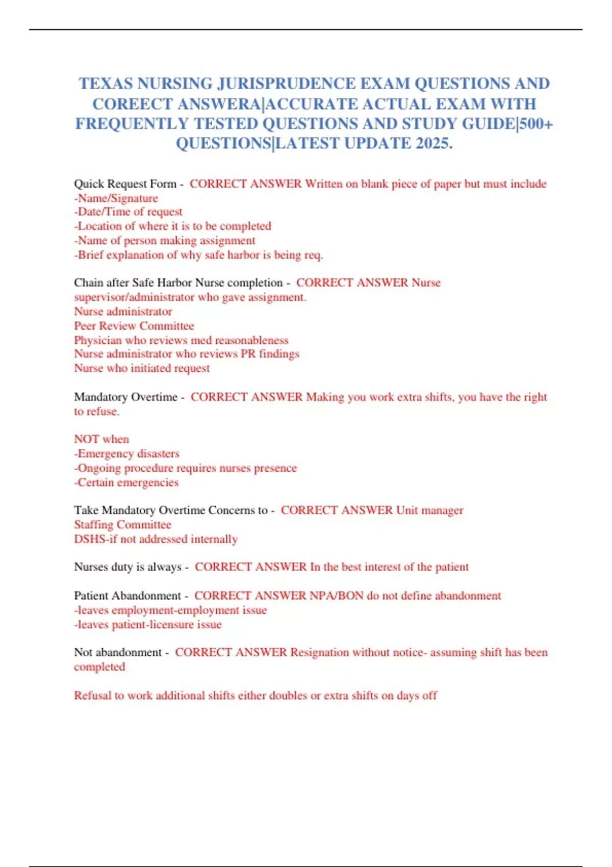 TEXAS NURSING JURISPRUDENCE EXAM QUESTIONS AND COREECT ANSWERA|ACCURATE ACTUAL EXAM WITH FREQUENTLY TESTED QUESTIONS AND STUDY GUIDE|500+ QUESTIONS|LATEST UPDATE 2025.TEXAS NURSING JURISPRUDENCE EXAM QUESTIONS AND COREECT ANSWERA|ACCURATE ACTUAL EXAM WITH FREQUENTLY TESTED QUESTIONS AND STUDY GUIDE|500+ QUESTIONS|LATEST UPDATE 2025.TEXAS NURSING JURISPRUDENCE EXAM QUESTIONS AND COREECT ANSWERA|ACCURATE ACTUAL EXAM WITH FREQUENTLY TESTED QUESTIONS AND STUDY GUIDE|500+ QUESTIONS|LATEST UPDATE 2025.