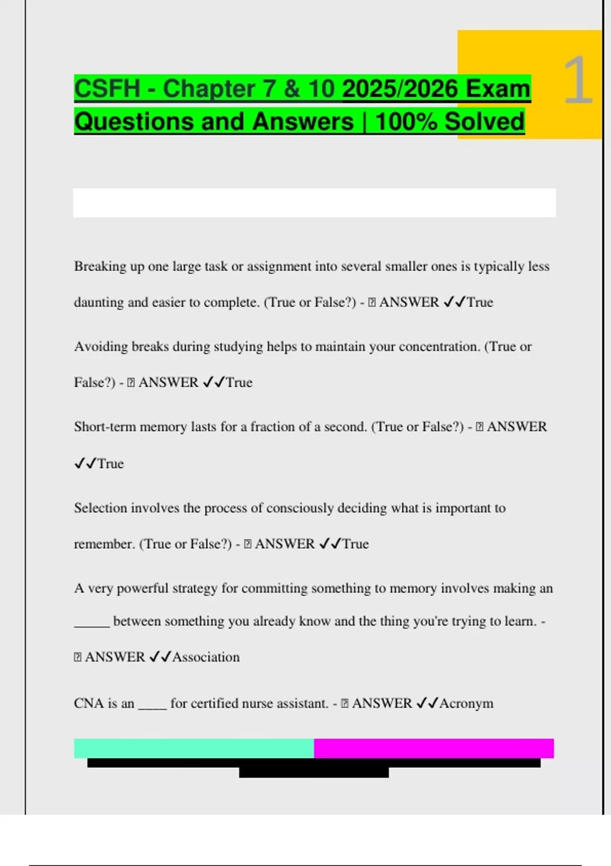 CSFH - Chapter 7 & 10 2025/2026 Exam Questions and Answers | 100% Solved Breaking up one large task or assignment into several smaller ones is typically less daunting and easier to complete. (True or False?) -