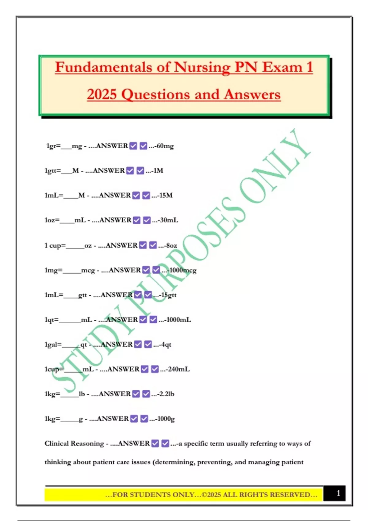 Fundamentals of Nursing PN Exam 1 2025 Questions and Answers