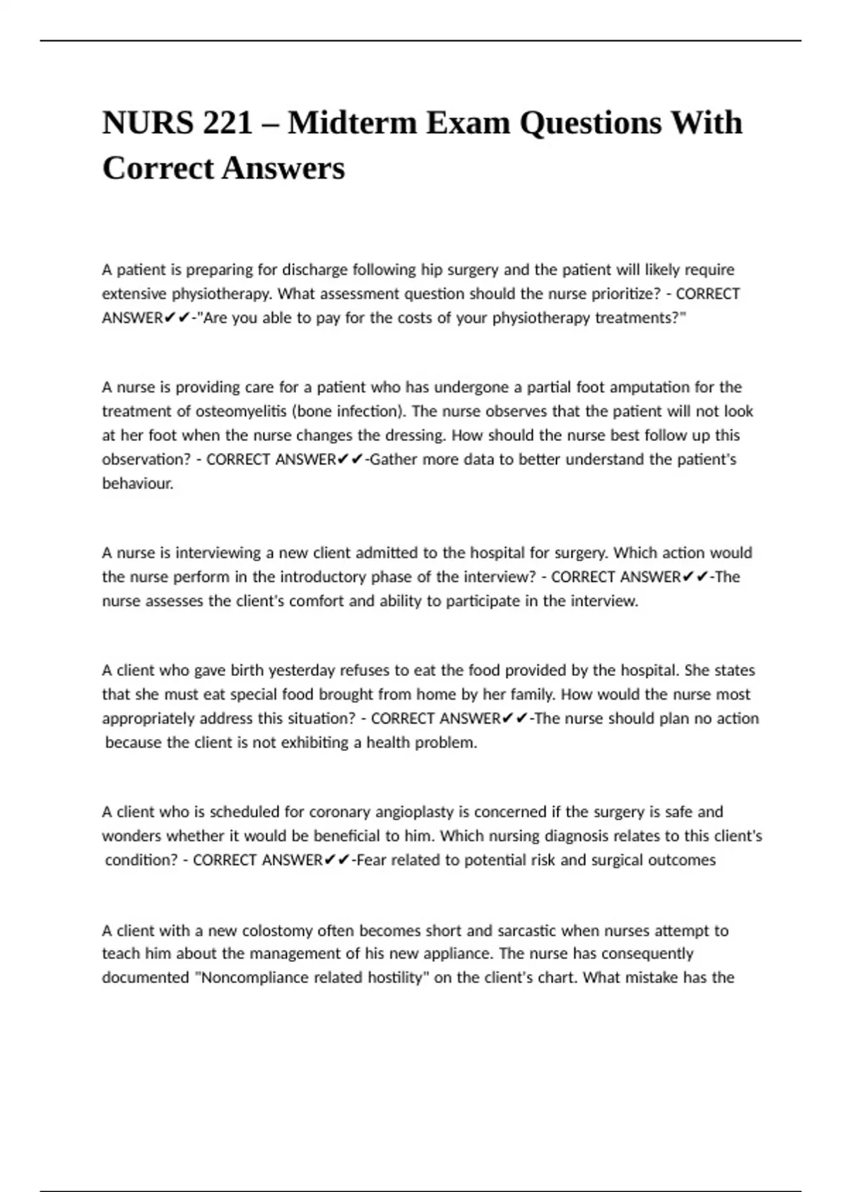 NURS 221 – Midterm Exam Questions With