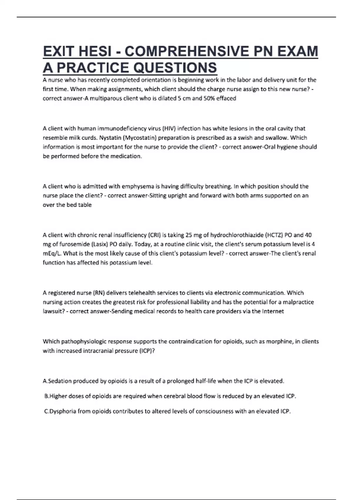 EXIT HESI - COMPREHENSIVE PN EXAM A PRACTICE QUESTIONS A nurse who has recently completed orientation is beginning work in the labor and delivery unit for the first time. When making assignments, which client should the charge nurse assign to this new nurse? - correct answer-A multiparous client who is dilated 5 cm and 50% effaced A client with human immunodeficiency virus (HIV) infection has white lesions in the oral cavity that resemble milk curds. Nystatin (Mycostatin) preparation is prescribed as a swish and swallow. Which information is most important for the nurse to provide the client? - correct answer-Oral hygiene should be performed before the medication. A client who is admitted with emphysema is having difficulty breathing. In which position should the nurse place the client? - correct answer-Sitting upright and forward with both arms supported on an over the bed table A client with chronic renal insufficiency (CRI) is taking 25 mg of hydrochlorothiazide (HCTZ) PO and 40 mg of furosemide (Lasix) PO daily. Today, at a routine clinic visit, the client's serum potassium level is 4 mEq/L. What is the most likely cause of this client's potassium level? - correct answer-The client's renal function has affected his potassium level. A registered nurse (RN) delivers telehealth services to clients via electronic communication. Which nursing action creates the greatest risk for professional liability and has the potential for a malpractice lawsuit? - correct answer-Sending medical records to health care providers via the Internet Which pathophysiologic response supports the contraindication for opioids, such as morphine, in clients with increased intracranial pressure (ICP)? A.Sedation produced by opioids is a result of a prolonged half-life when the ICP is elevated. B.Higher doses of opioids are required when cerebral blood flow is reduced by an elevated ICP. C.Dysphoria from opioids contributes to altered levels of consciousness with an elevated ICP.