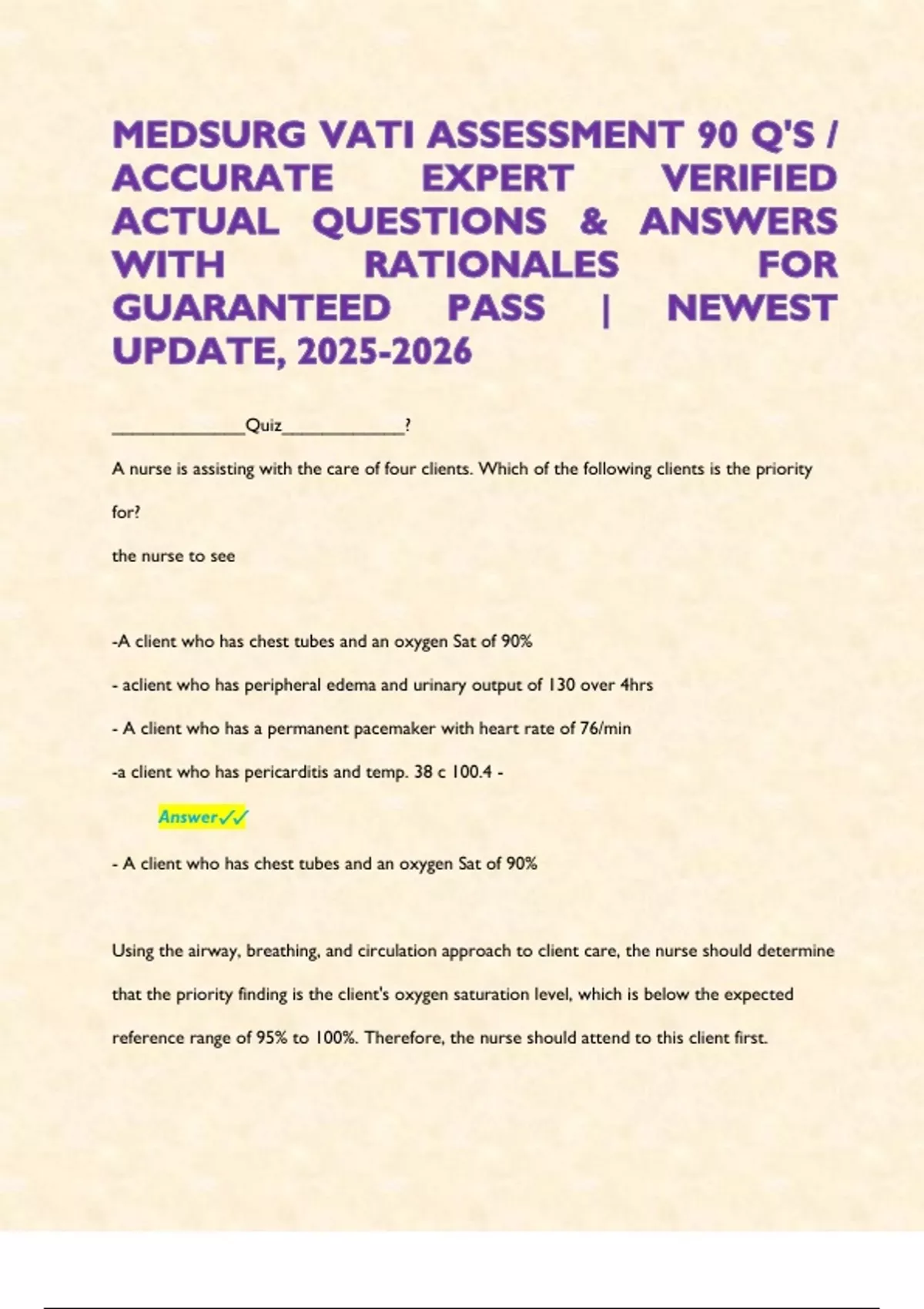 MEDSURG VATI ASSESSMENT 90 Q'S / ACCURATE EXPERT VERIFIED ACTUAL QUESTIONS & ANSWERS WITH RATIONALES FOR GUARANTEED PASS | NEWEST UPDATE, _____________Quiz____________? A nurse is assisting with the care of four clients. Which of the following clients is the priority for? the nurse to see -A client who has chest tubes and an oxygen Sat of 90% - aclient who has peripheral edema and urinary output of 130 over 4hrs - A client who has a permanent pacemaker with heart rate of 76/min -a client who has pericarditis and temp. 38 c 100.4 - Answer - A client who has chest tubes and an oxygen Sat of 90%