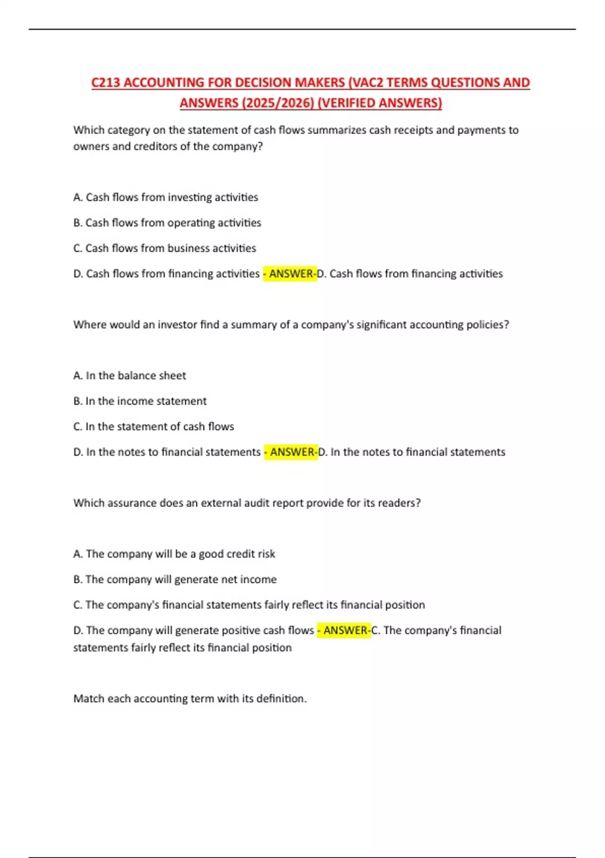 C213 ACCOUNTING FOR DECISION MAKERS (VAC2 TERMS QUESTIONS AND