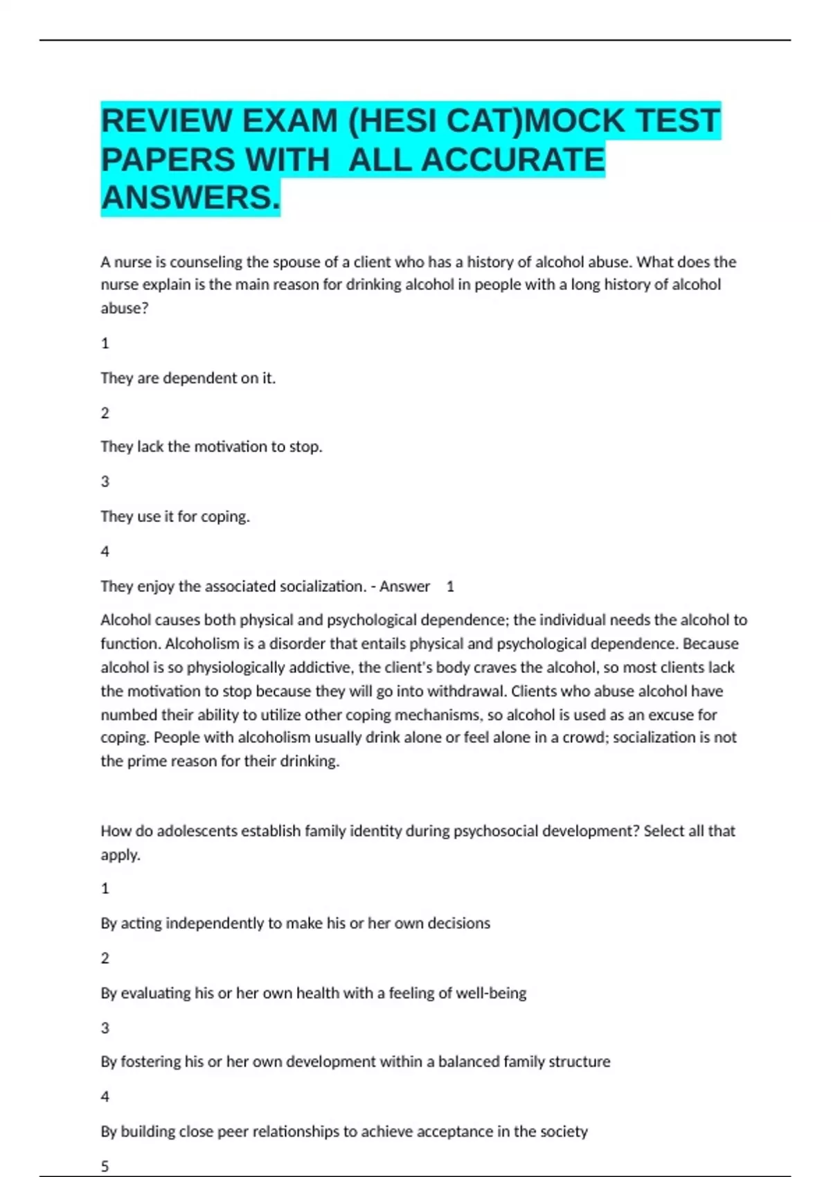 A nurse is counseling the spouse of a client who has a history of alcohol abuse. What does the nurse explain is the main reason for drinking alcohol in people with a long history of alcohol abuse? 1 They are dependent on it. 2 They lack the motivation to stop. 3 They use it for coping. 4 They enjoy the associated socialization. - Answer 1 Alcohol causes both physical and psychological dependence; the individual needs the alcohol to function. Alcoholism is a disorder that entails physical and psychological dependence. Because alcohol is so physiologically addictive, the client's body craves the alcohol, so most clients lack the motivation to stop because they will go into withdrawal. Clients who abuse alcohol have numbed their ability to utilize other coping mechanisms, so alcohol is used as an excuse for coping. People with alcoholism usually drink alone or feel alone in a crowd; socialization is not the prime reason for their drinking. How do adolescents establish family identity during psychosocial development? Select all that apply. 1 By acting independently to make his or her own decisions 2 By evaluating his or her own health with a feeling of well-being 3 By fostering his or her own development within a balanced family structure 4 By building close peer relationships to achieve acceptance in the society 5 By achieving marked physical changes - Answer 13 An adolescent establishes family identity by acting independently for taking important decisions about self. They also need to foster their development along with maintaining a balanced family structure. Health identity is associated with the evaluation of one's own health with a feeling of