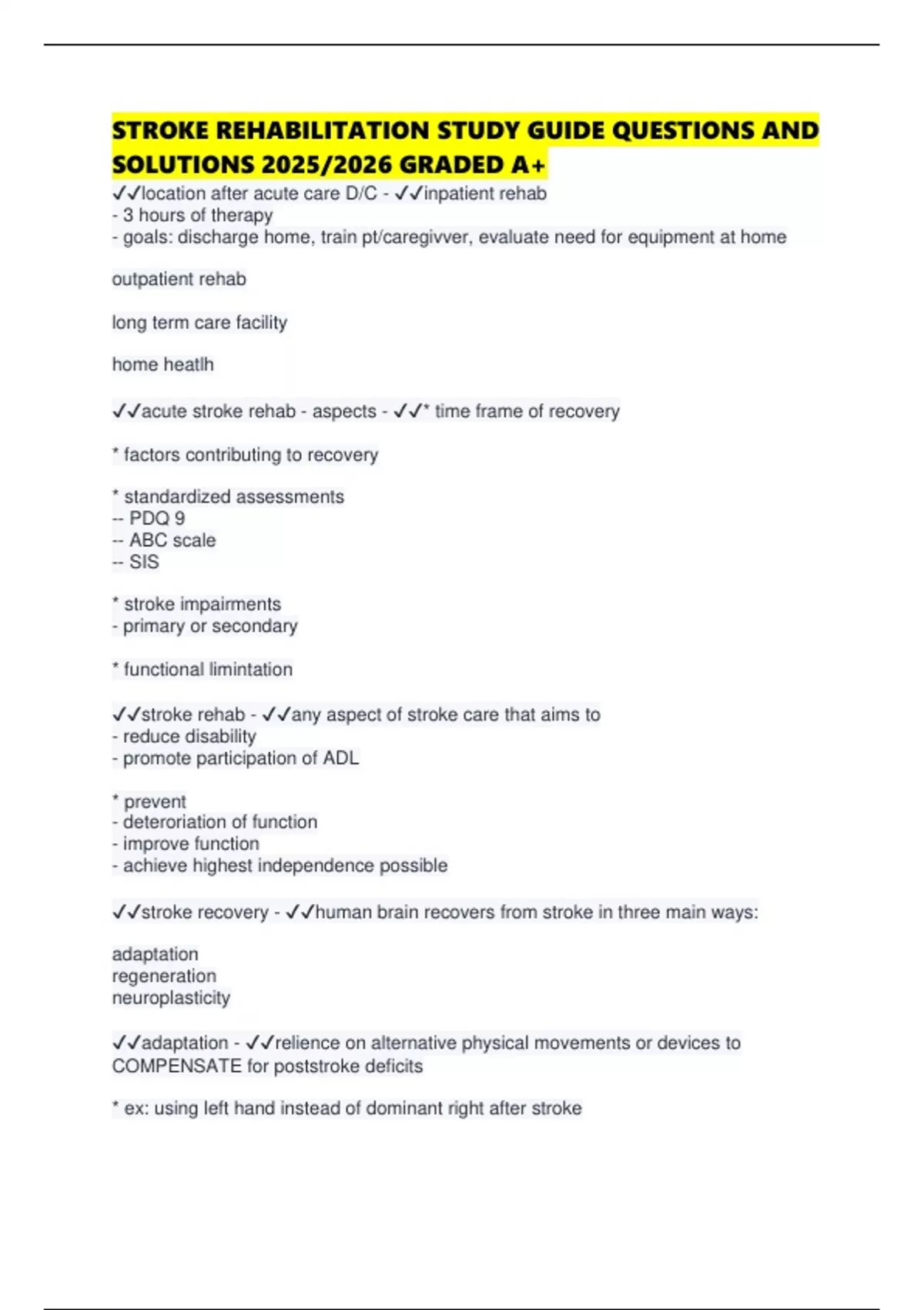 STROKE REHABILITATION STUDY GUIDE QUESTIONS AND SOLUTIONS 2025/2026 GRADED A+