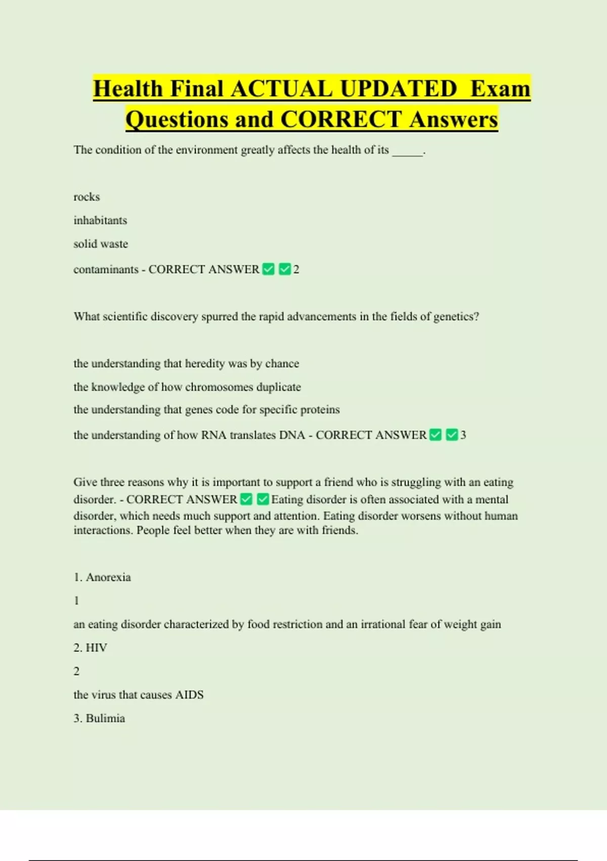 Health Final ACTUAL UPDATED Exam Questions and CORRECT Answers The condition of the environment greatly affects the health of its _____. rocks inhabitants solid waste contaminants - CORRECT ANSWER 2 What scientific discovery spurred the rapid advancements in the fields of genetics?