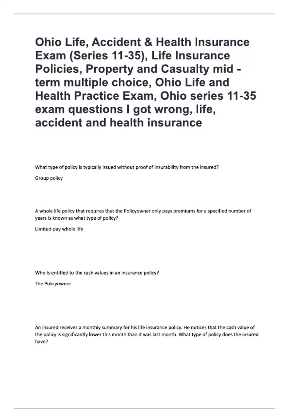 Ohio Life, Accident & Health Insurance Exam (Series 11-35), Life Insurance Policies Exam Package Deal 2025/ 2026 Exam: Verified Questions and Answers Rated A+.