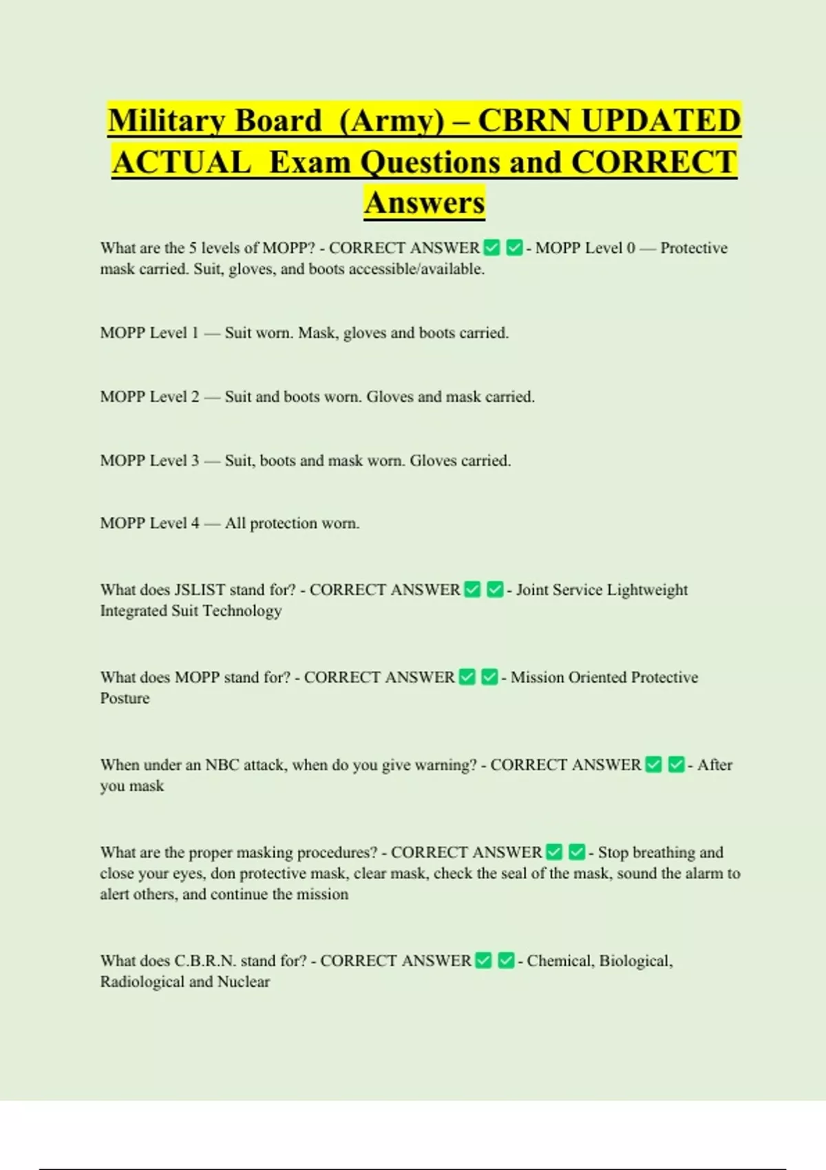 Military Board (Army) – CBRN UPDATED ACTUAL Exam Questions and CORRECT Answers What are the 5 levels of MOPP? - CORRECT ANSWER mask carried. Suit, gloves, and boots accessible/available. MOPP Level 1 — Suit worn. Mask, gloves and boots carried. - MOPP Level 0 — Protective MOPP Level 2 — Suit and boots worn. Gloves and mask carried. MOPP Level 3 — Suit, boots and mask worn. Gloves carried