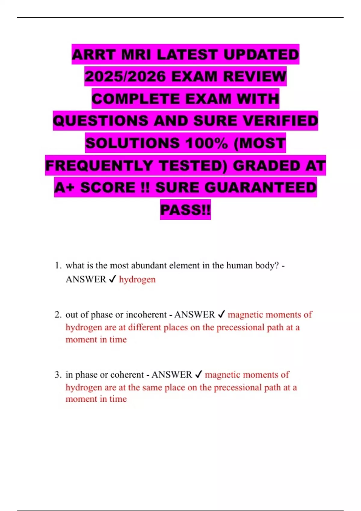 ARRT MRI LATEST UPDATED 2025/2026 EXAM REVIEW COMPLETE EXAM WITH QUESTIONS AND SURE VERIFIED SOLUTIONS 100% (MOST FREQUENTLY TESTED) GRADED AT A+ SCORE !! SURE GUARANTEED PASS!! 1. what is the most abundant element in the human body? - ANSWER hydrogen 2. out of phase or incoherent - ANSWER magnetic moments of hydrogen are at different places on the precessional path at a moment in time 3. in phase or coherent - ANSWER magnetic moments of hydrogen are at the same place on the precessional path at a moment in time 4. what two things do you need to get signal? - ANSWER 1) coherent 2) transverse magnetization 5. phase refers to - ANSWER the position of a magnetic moment of a spin on its precessional path at any moment in time 6. B1 field is used to deliver an RF pulse which does what 2 things - ANSWER causes 1) transverse magnetization and 2) phase precession 7. an RF excitation pulse causes - ANSWER resonance 8. nuclei that are available for MRI are those that exhibit a _________ - ANSWER net spin 9. low energy = spin up = _______ - ANSWER parallel 10. high energy = spin down = __________ - ANSWER antiparallel 11. thermal equilibrium - ANSWER when the body is in the magnetic field, spins are aligned, and nothing else has happened 12. B0 - ANSWER refers to large magnetic field of the MRI scanner 13. at thermal equilibrium there are a ________ portion of spins with their magnetic moments aligned in the same direction as B0 than against it - ANSWER greater 14. the reason why SNR increases at higher field strengths is because - ANSWER the NMV also increases in size the stronger B0 15. 1 hertz = - ANSWER 1 cycle per second 16. larmour equation - ANSWER W0 = y x B0 17. what do the parts of the larmor equation mean? - ANSWER W0 = Larmour frequency (precessional frequency) y = gyromagnetic ratio (42.58 MHz/T for hydrogen) B0 = Field strength 18. what is the precessional frequency for hydrogen at 1.5T? - ANSWER 63.87 MHz (42.58 MHz/T x 1.5T) 19. transverse magnetization occurs at __ degrees to B0 - ANSWER 90 20. saturation occurs when - ANSWER spins are unable to absorb more energy or to be stimulated and release more energy 21. what is a saturation pulse - ANSWER 180 degree RF 22. dephasing and relaxation happen at the same time but are - ANSWER independent of eachother 23. relaxation - ANSWER the process in which hydrogen lose energy (occurs after RF excitation pulse is switched off) 24. dephasing is caused by - ANSWER field inhomogeneities in the B0 field and interactions between spins and tissue 25. why is it called FID (free induction decay) - ANSWER spins FREEly precess influenced only by B0, signal DECAYs with time, and magnetic moments of the spins INDUCE a current in receiver coil 26. when RF excitation pulse is removed, the mag moments of all spins ____ and ______ - ANSWER dephase and produce a FID 27. TR (repetition time) - ANSWER time from application of one RF excitation pulse to the application of the next one determines how much longitudinal relaxation occurs (T1 weighting) 28. TE (echo time) - ANSWER time from application of RF