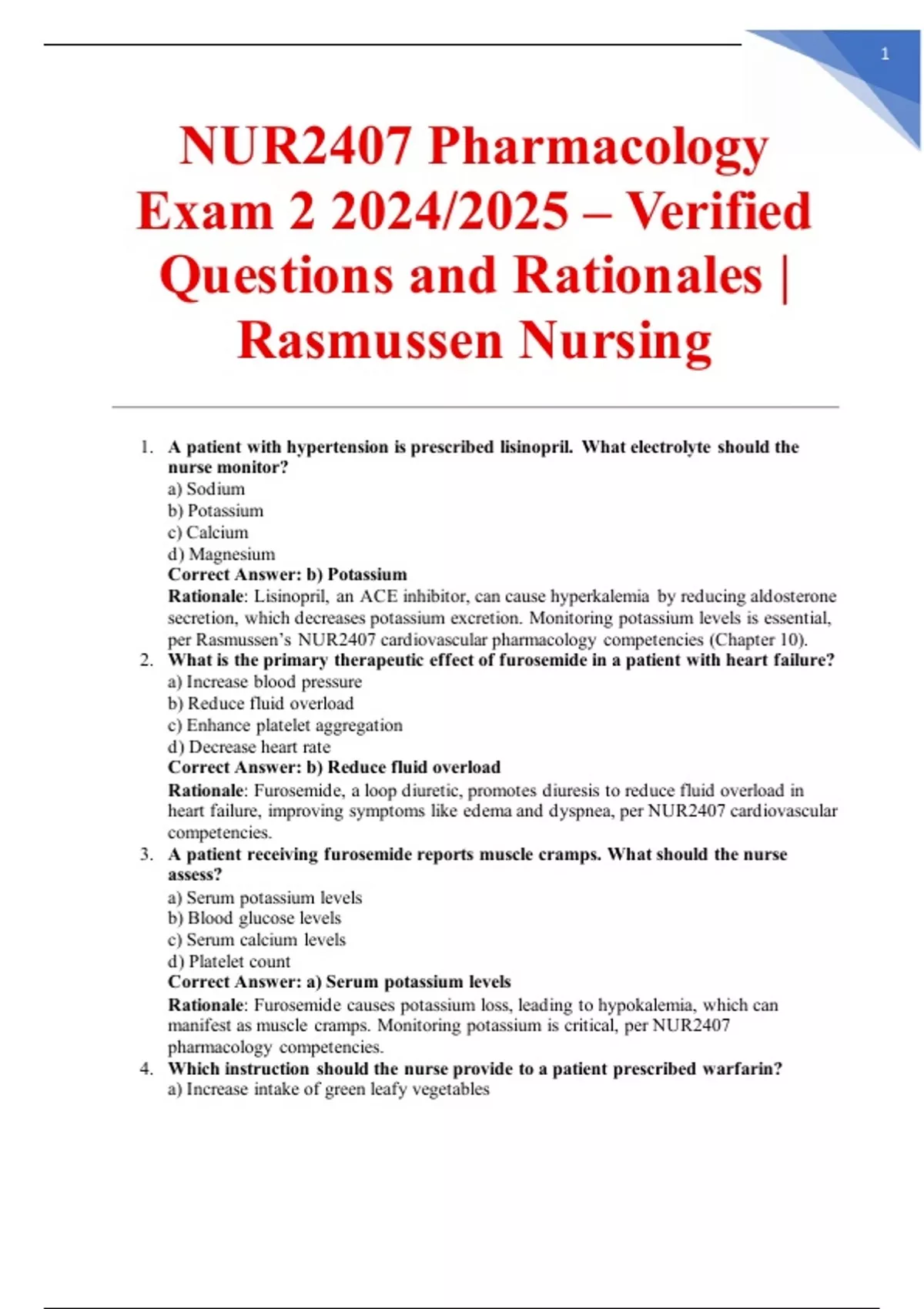 NUR2407 Pharmacology Exam 2 2024/2025 – Verified Questions and Rationales | Rasmussen Nursing