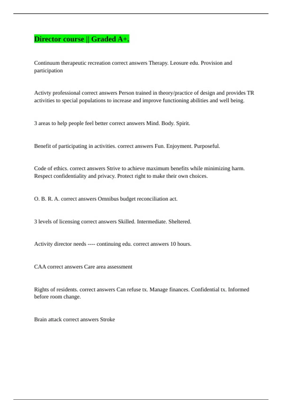 Continuum therapeutic recreation correct answers Therapy. Leosure edu. Provision and participation Activty professional correct answers Person trained in theory/practice of design and provides TR activities to special populations to increase and improve functioning abilities and well being. 3 areas to help people feel better correct answers Mind. Body. Spirit. Benefit of participating in activities. correct answers Fun. Enjoyment. Purposeful. Code of ethics. correct answers Strive to achieve maximum benefits while minimizing harm. Respect confidentiality and privacy. Protect right to make their own choices. O. B. R. A. correct answers Omnibus budget reconciliation act. 3 levels of licensing correct answers Skilled. Intermediate. Sheltered. Activity director needs ---- continuing edu. correct answers 10 hours. CAA correct answers Care area assessment Rights of residents. correct answers Can refuse tx. Manage finances. Confidential tx. Informed before room change. Brain attack correct answers Stroke