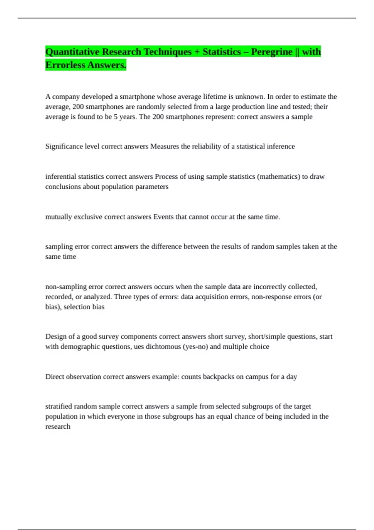 A company developed a smartphone whose average lifetime is unknown. In order to estimate the average, 200 smartphones are randomly selected from a large production line and tested; their average is found to be 5 years. The 200 smartphones represent: correct answers a sample Significance level correct answers Measures the reliability of a statistical inference inferential statistics correct answers Process of using sample statistics (mathematics) to draw conclusions about population parameters mutually exclusive correct answers Events that cannot occur at the same time. sampling error correct answers the difference between the results of random samples taken at the same time non-sampling error correct answers occurs when the sample data are incorrectly collected, recorded, or analyzed. Three types of errors: data acquisition errors, non-response errors (or bias), selection bias Design of a good survey components correct answers short survey, short/simple questions, start with demographic questions, ues dichtomous (yes-no) and multiple choice Direct observation correct answers example: counts backpacks on campus for a day stratified random sample correct answers a sample from selected subgroups of the target population in which everyone in those subgroups has an equal chance of being included in the research