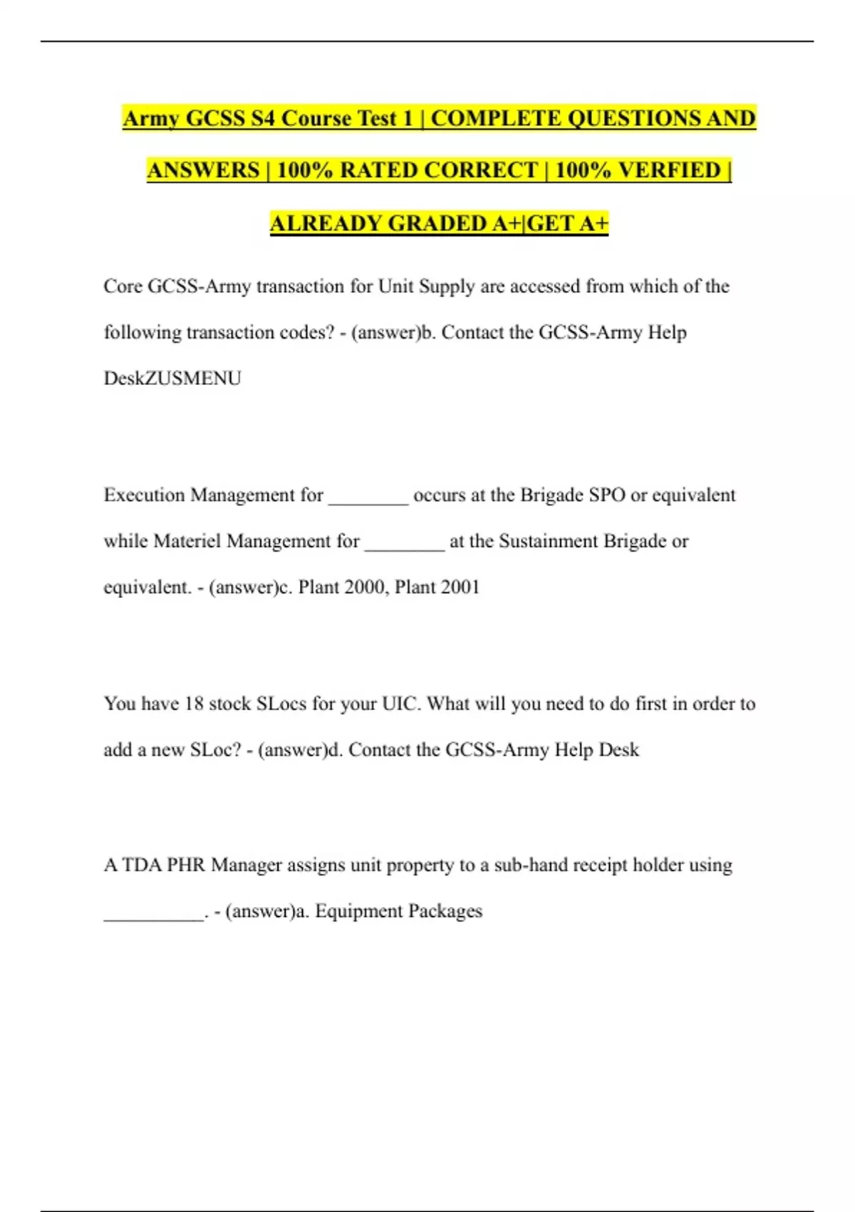 Army GCSS S4 Course Test 1 | COMPLETE QUESTIONS AND ANSWERS | 100% RATED CORRECT | 100% VERFIED | ALREADY GRADED A+|GET A+