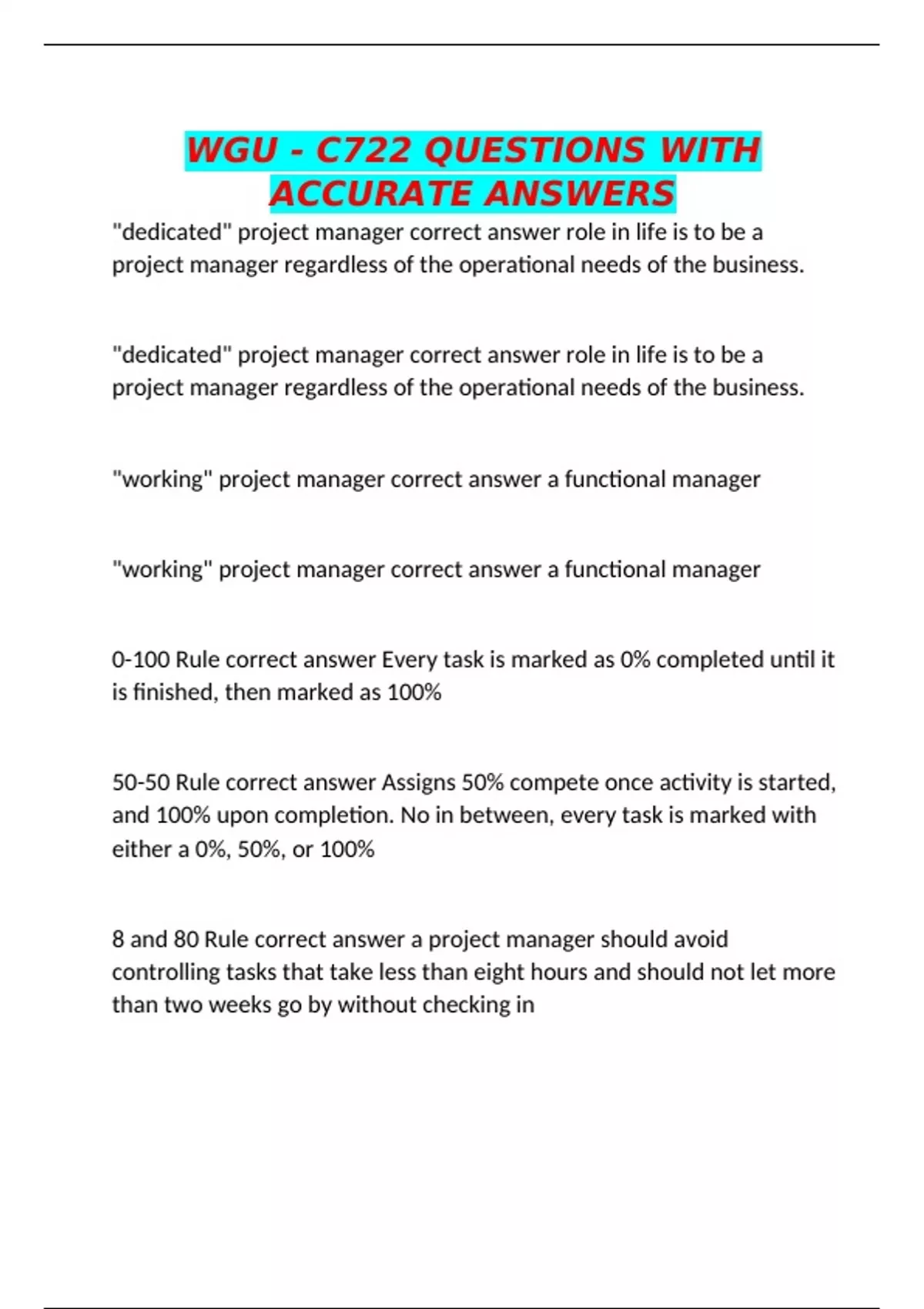 "dedicated" project manager correct answer role in life is to be a project manager regardless of the operational needs of the business. "dedicated" project manager correct answer role in life is to be a project manager regardless of the operational needs of the business. "working" project manager correct answer a functional manager "working" project manager correct answer a functional manager 0-100 Rule correct answer Every task is marked as 0% completed until it is finished, then marked as 100% 50-50 Rule correct answer Assigns 50% compete once activity is started, and 100% upon completion. No in between, every task is marked with either a 0%, 50%, or 100% 8 and 80 Rule correct answer a project manager should avoid controlling tasks that take less than eight hours and should not let more than two weeks go by without checking in