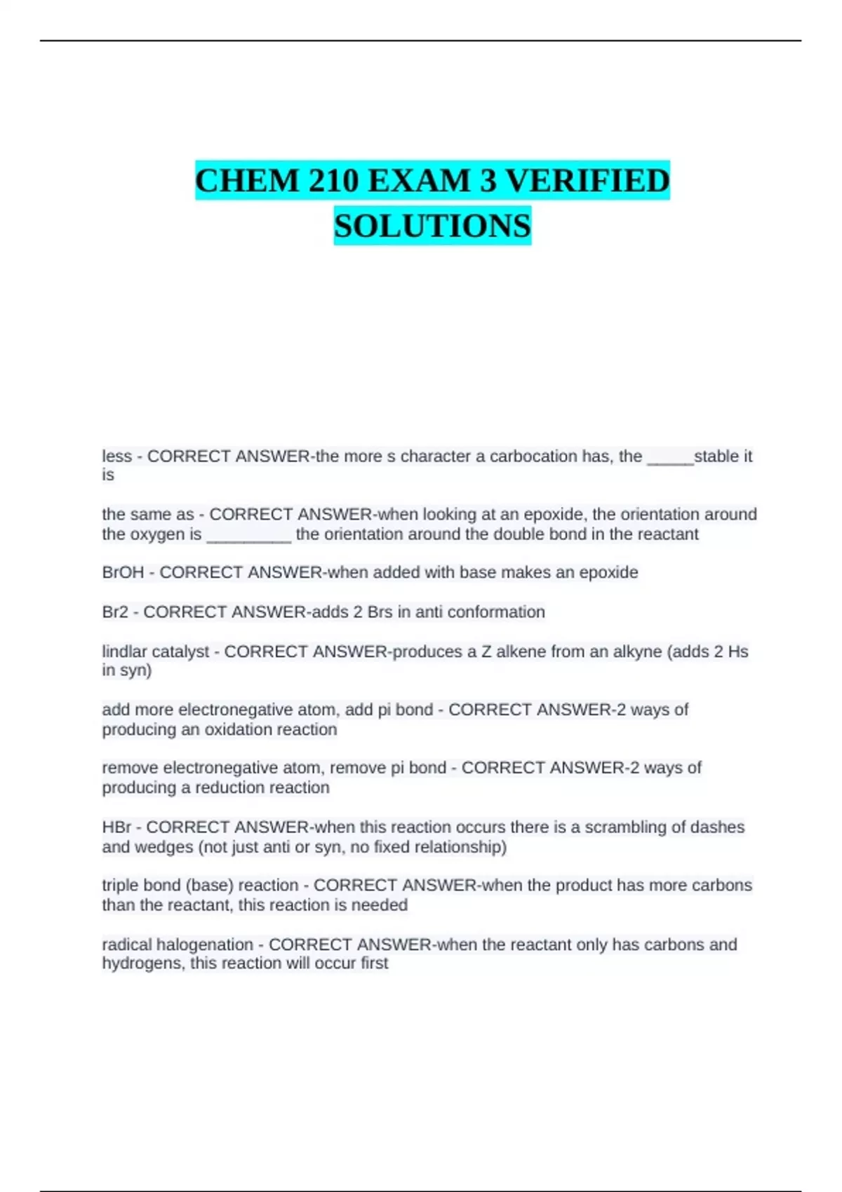 Br2 - CORRECT ANSWER-adds 2 Brs in anti conformation