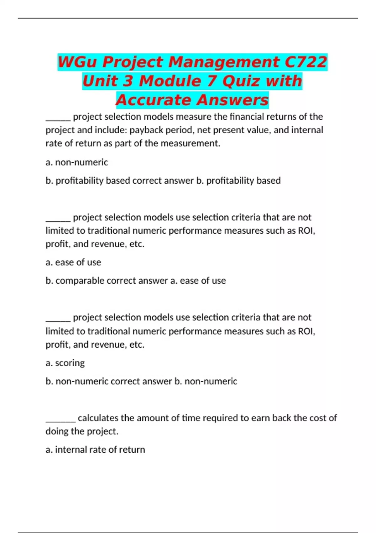 _____ project selection models measure the financial returns of the project and include: payback period, net present value, and internal rate of return as part of the measurement. a. non-numeric b. profitability based correct answer b. profitability based _____ project selection models use selection criteria that are not limited to traditional numeric performance measures such as ROI, profit, and revenue, etc. a. ease of use b. comparable correct answer a. ease of use _____ project selection models use selection criteria that are not limited to traditional numeric performance measures such as ROI, profit, and revenue, etc. a. scoring b. non-numeric correct answer b. non-numeric ______ calculates the amount of time required to earn back the cost of doing the project. a. internal rate of return