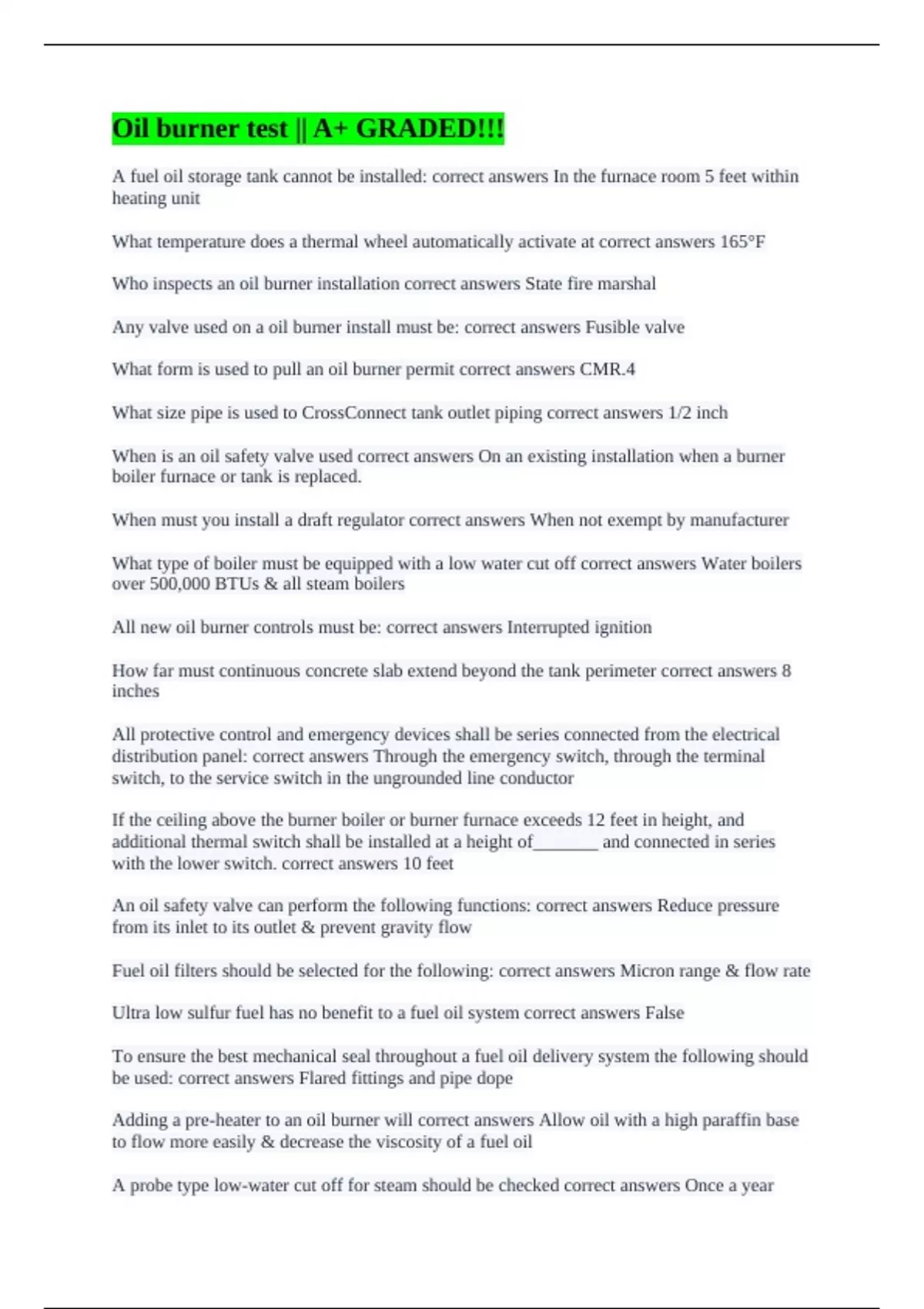 A fuel oil storage tank cannot be installed: correct answers In the furnace room 5 feet within heating unit What temperature does a thermal wheel automatically activate at correct answers 165°F Who inspects an oil burner installation correct answers State fire marshal Any valve used on a oil burner install must be: correct answers Fusible valve What form is used to pull an oil burner permit correct answers CMR.4 What size pipe is used to CrossConnect tank outlet piping correct answers 1/2 inch When is an oil safety valve used correct answers On an existing installation when a burner boiler furnace or tank is replaced. When must you install a draft regulator correct answers When not exempt by manufacturer What type of boiler must be equipped with a low water cut off correct answers Water boilers over 500,000 BTUs & all steam boilers All new oil burner controls must be: correct answers Interrupted ignition How far must continuous concrete slab extend beyond the tank perimeter correct answers 8 inches All protective control and emergency devices shall be series connected from the electrical distribution panel: correct answers Through the emergency switch, through the terminal switch, to the service switch in the ungrounded line conductor If the ceiling above the burner boiler or burner furnace exceeds 12 feet in height, and additional thermal switch shall be installed at a height of_______ and connected in series with the lower switch. correct answers 10 feet An oil safety valve can perform the following functions: correct answers Reduce pressure from its inlet to its outlet & prevent gravity flow Fuel oil filters should be selected for the following: correct answers Micron range & flow rate Ultra low sulfur fuel has no benefit to a fuel oil system correct answers False To ensure the best mechanical seal throughout a fuel oil delivery system the following should be used: correct answers Flared fittings and pipe dope Adding a pre-heater to an oil burner will correct answers Allow oil with a high paraffin base to flow more easily & decrease the viscosity of a fuel oil A probe type low-water cut off for steam should be checked correct answers Once a year