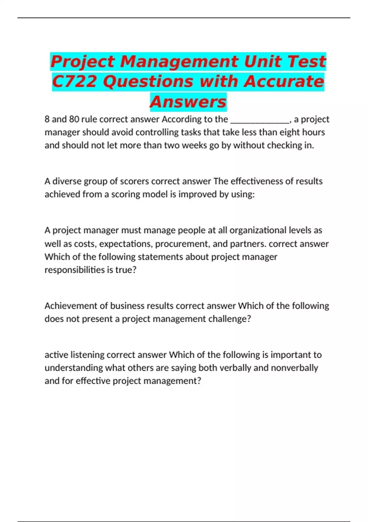 8 and 80 rule correct answer According to the ____________, a project manager should avoid controlling tasks that take less than eight hours and should not let more than two weeks go by without checking in. A diverse group of scorers correct answer The effectiveness of results achieved from a scoring model is improved by using: A project manager must manage people at all organizational levels as well as costs, expectations, procurement, and partners. correct answer Which of the following statements about project manager responsibilities is true? Achievement of business results correct answer Which of the following does not present a project management challenge? active listening correct answer Which of the following is important to understanding what others are saying both verbally and nonverbally and for effective project management? agile correct answer The _________method of project management has been developed for use on projects where the end product is not clearly defined in advance.