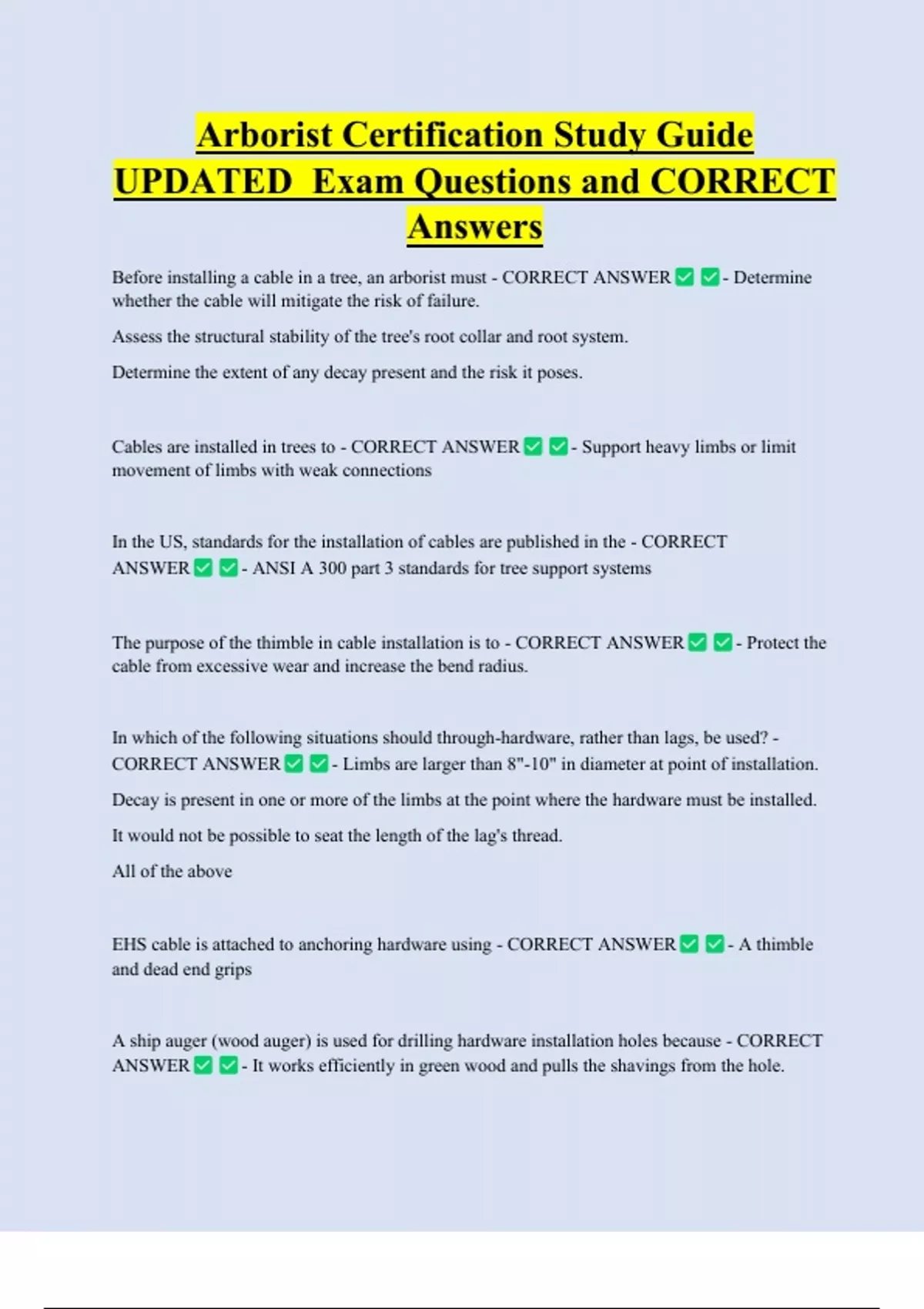 Arborist Certification Study Guide UPDATED Exam Questions and CORRECT Answers Before installing a cable in a tree, an arborist must - CORRECT ANSWER whether the cable will mitigate the risk of failure. Assess the structural stability of the tree's root collar and root system. Determine the extent of any decay present and the risk it poses. Cables are installed in trees to - CORRECT ANSWER movement of limbs with weak connections - Determine - Support heavy limbs or limit
