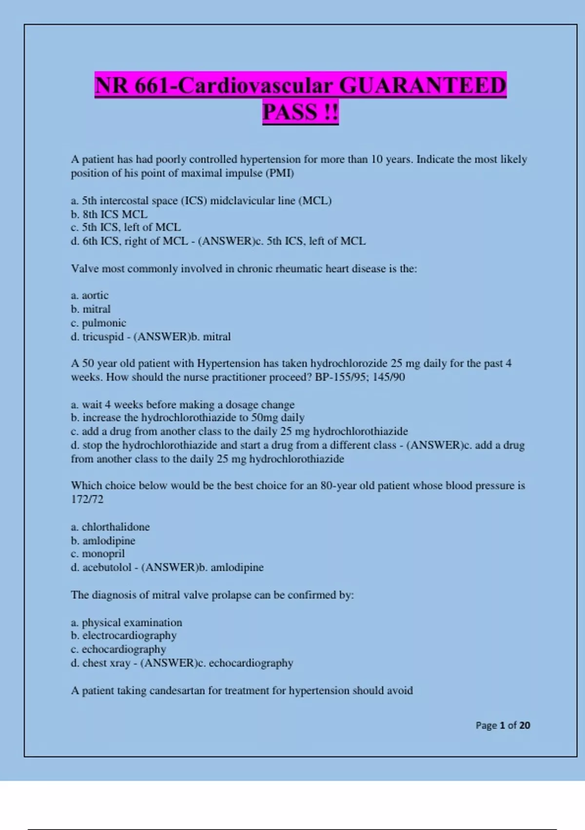 NR 661-Cardiovascular GUARANTEED PASS !! NR 661-Cardiovascular GUARANTEED PASS !!