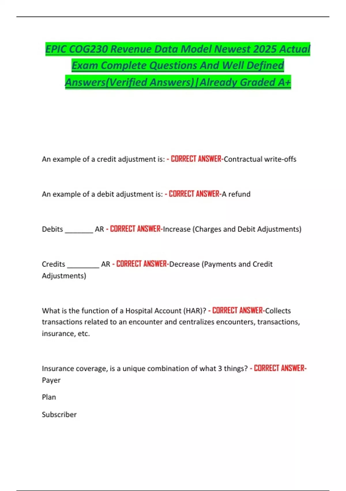EPIC COG230 Revenue Data Model Newest 2025 Actual Exam Complete Questions And Well Defined Answers(Verified Answers)|Already Graded A+