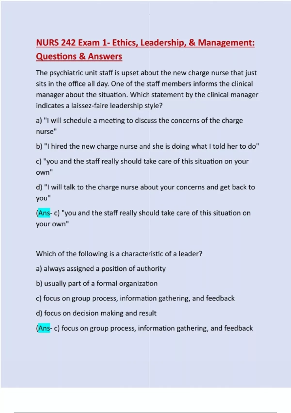 NURS 242 Exam 1 :(Ethics, Leadership, & Management: Questions & Answers: Updated A+ Score Guide Solution