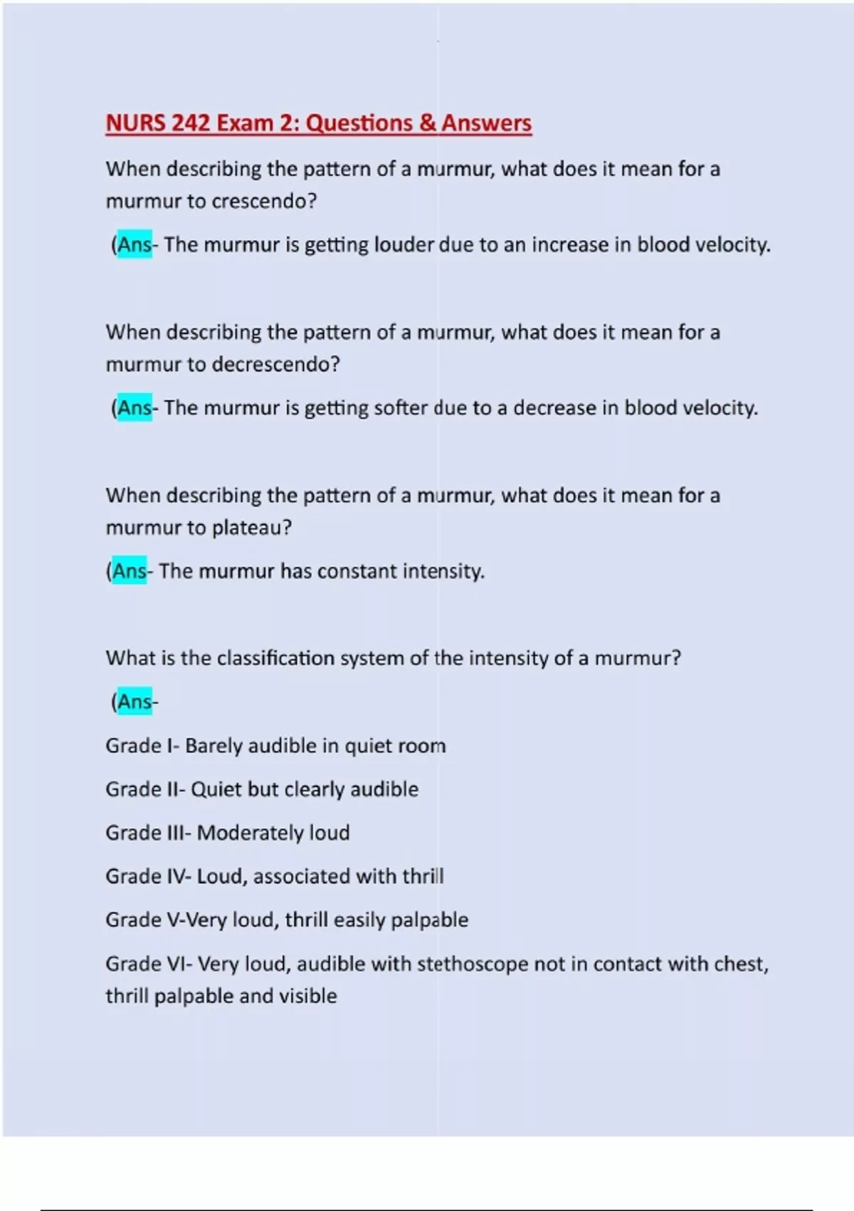 When describing the pattern of a murmur, what does it mean for a murmur to crescendo? (Ans- The murmur is getting louder due to an increase in blood velocity. When describing the pattern of a murmur, what does it mean for a murmur to decrescendo? (Ans- The murmur is getting softer due to a decrease in blood velocity. When describing the pattern of a murmur, what does it mean for a murmur to plateau? (Ans- The murmur has constant intensity. What is the classification system of the intensity of a murmur? (AnsGrade I- Barely audible in quiet room Grade II- Quiet but clearly audible Grade III- Moderately loud Grade IV- Loud, associated with thrill Grade V-Very loud, thrill easily palpable Grade VI- Very loud, audible with stethoscope not in contact with chest, thrill palpable and visibleWhat are three ways to describe the quality of a murmur? (AnsHarsh Raspy Machine-like Vibratory Musical Blowing The presence of early, soft physiologic murmurs can be caused by what in older adult patients? (AnsAortic lengthening Torturosity Sclerotic changes Murmur with a low-frequency diastolic rumble, often caused by childhood rheumatic fever or a cardiac infection. (Ans- Mitral Valve Stenosis