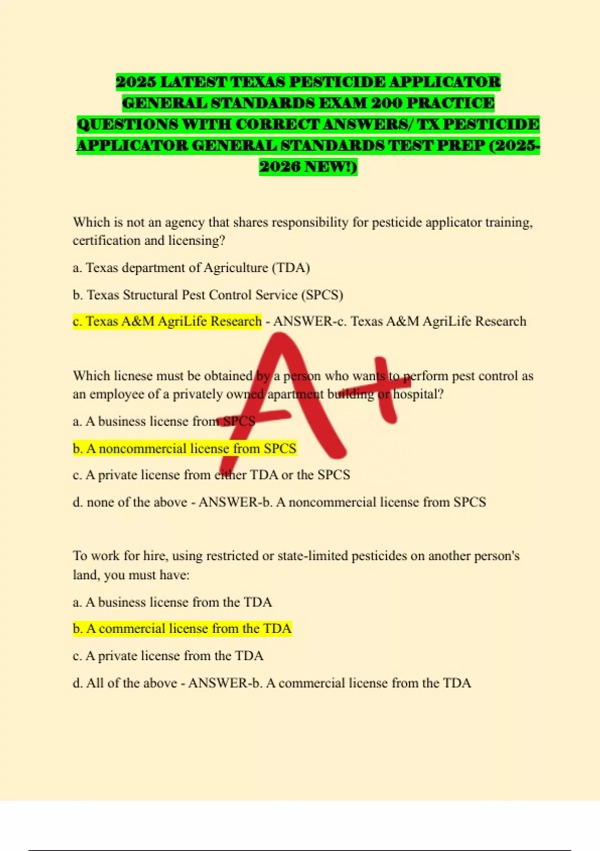 QUESTIONS WITH CORRECT ANSWERS/ TX PESTICIDE