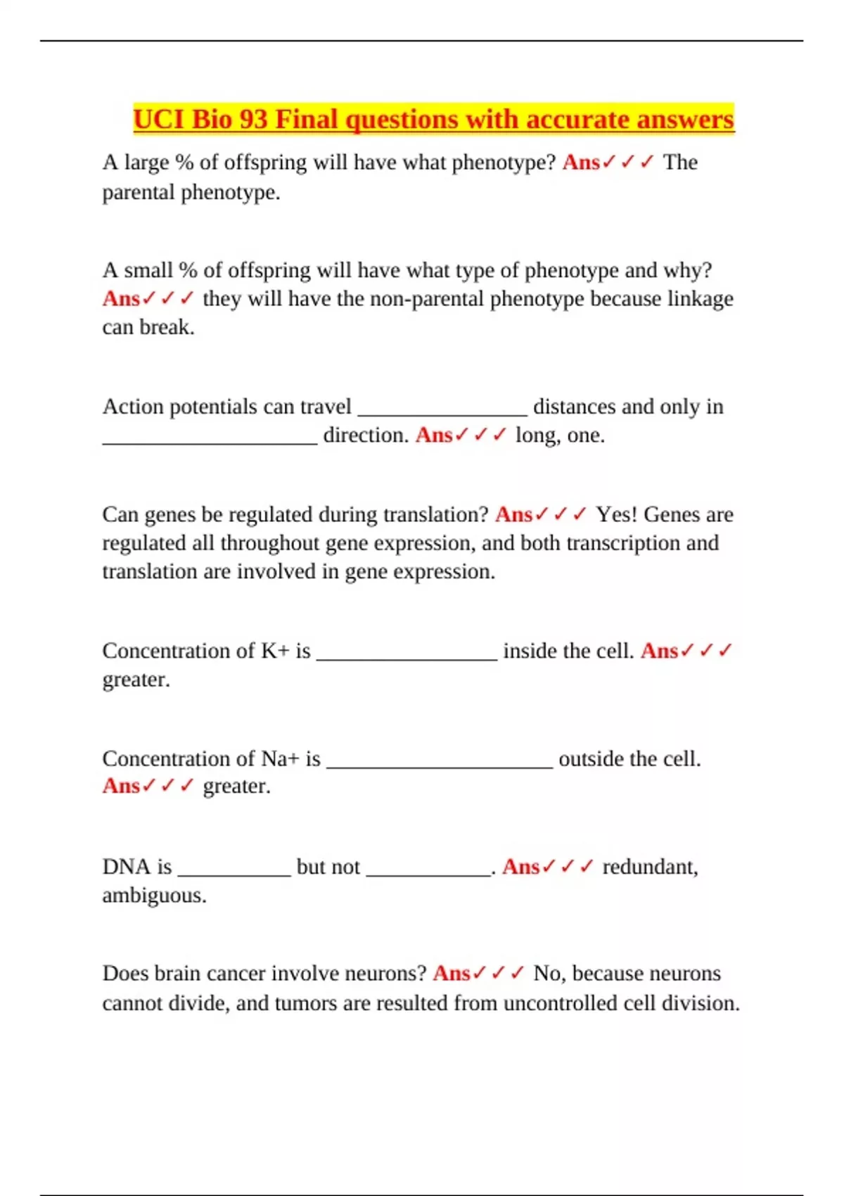 UCI Bio 93 – Final Exam Master Question Bank with Accurate Answers (University of California, Irvine)