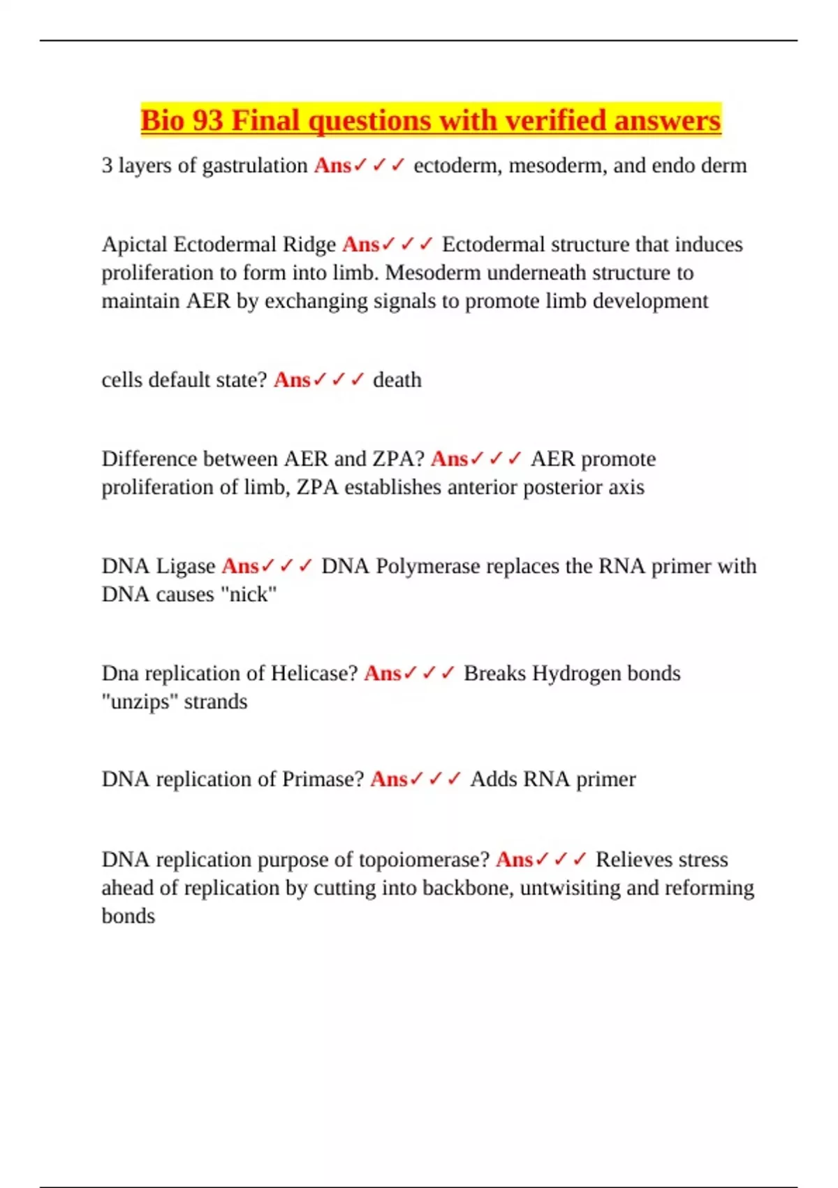 Bio 93 Final questions with verified answers