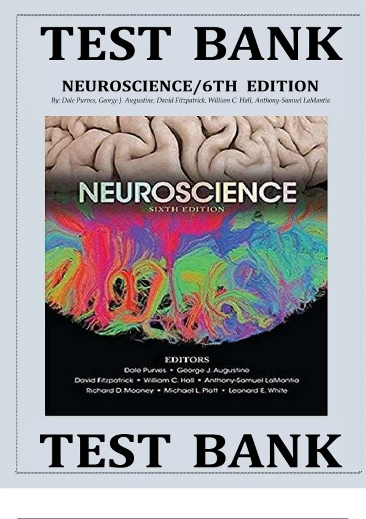This complete test bank corresponds to the 6th Edition of Neuroscience by Purves and colleagues. It features chapter-specific multiple-choice and conceptual questions covering fundamental and advanced topics in neurobiology, including neural signaling, sensory and motor systems, brain development, and higher-order functions. Ideal for exam preparation in undergraduate and graduate-level neuroscience courses.